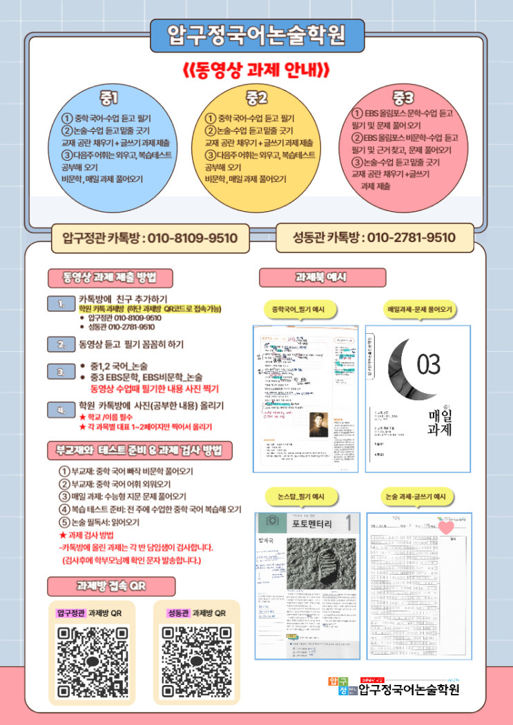 동영상 신청하는 학생들은 현강 들은 학생들 보다더 꼼꼼히 다음주 과제 준비를 해야 합니다. 학원 카톡방에 ~ 동영상 듣고 필기한 내용을 찰칵!!!! 사진 찍어서 올려 주면 됩니다. 내가 가장 잘했다고 생각되는 페이지(각 과목당 1~2페이지) 올리면 됩니다. 여기서~ 꼭 해야하는 건! 바로 학교 /이름 기재하는 겁니다. 동영상 수업한 학생도 다음주에 똑같이 주차 테스트를 진행합니다. 필독서 읽고 글쓰기 과제도 하고 복습테스트 공부도 해오고 어휘도 외우고 매일과제도 풀고~;; 할게 너무 많지만 내일을 위한 도전! 열심히 합시다.^^ 아래 지침서 필독해 주세요! <img src="https://blogthumb.pstatic.net/MjAyNjAzMzFfMTgy/MDAxNzc0OTQ2OTIxNDY5.a4QCpLb6YC79Kuo6AQYSQX_pSWdqSaA12NF7e_7gxK4g.ytdO_fsmxdneX0FpbnaddgUMk0dGQJ3J2rTzVrS-3fMg.PNG/%C1%DF%B5%EE_%B5%BF%BF%B5%BB%F3%B0%FA%C1%A6_%BE%C8%B3%BB-001.png?type=s3" />