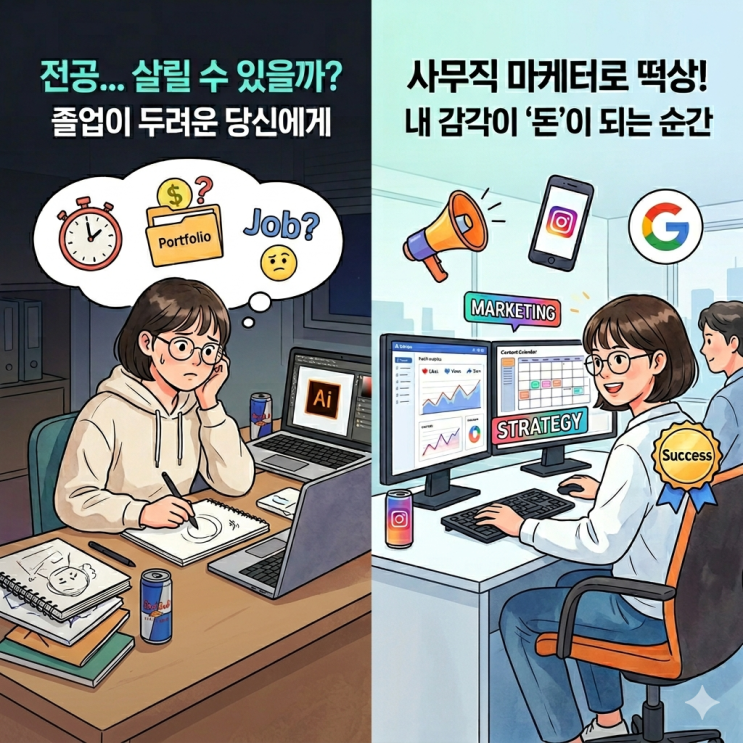 과제하느라 밤샜는데, 내 미래는 밤샘의 연속일까? 디자인 전공생이라면 졸업을 앞두고 한 번쯤 이런 고민 해보셨을 거예요. "에이전시 가서 수정 지옥에 빠지긴 싫은데... 그렇다고 내 감각을 버리고 완전 생뚱맞은 사무직을 할 수도 없고..." 공들여 쌓아온 내 디자인 실력, '워라밸' 좋은 일반 기업 사무직에서 무기로 쓸 수 있는 방법이 있다면 어떨까요? 오늘은 그 치트키 같은 직무, '디지털 마케터'에 대해 이야기해 보려 합니다! ✅ 디자인 전공 취업 분야 기업 마케팅팀에서 디자인 전공자를 뽑으면 입이 귀에 걸리는 이유, 딱 3가지만 꼽아볼게요. 비주얼 소통 기획자가 음.. 좀 힙하면서도 고....... <img src="https://blogthumb.pstatic.net/MjAyNjA0MDdfMjcg/MDAxNzc1NTUwNzMzOTc5.zXDs04kFv930ZgGhr79cXZmRORCj-5Xz2se_49j8orIg.HLK3_SXIyJzpKkAdzOkKDw7LmU4EzD_ePCs1c-3eEHcg.PNG/Gemini_Generated_Image_y6bjjjy6bjjjy6bj.png?type=s3" />