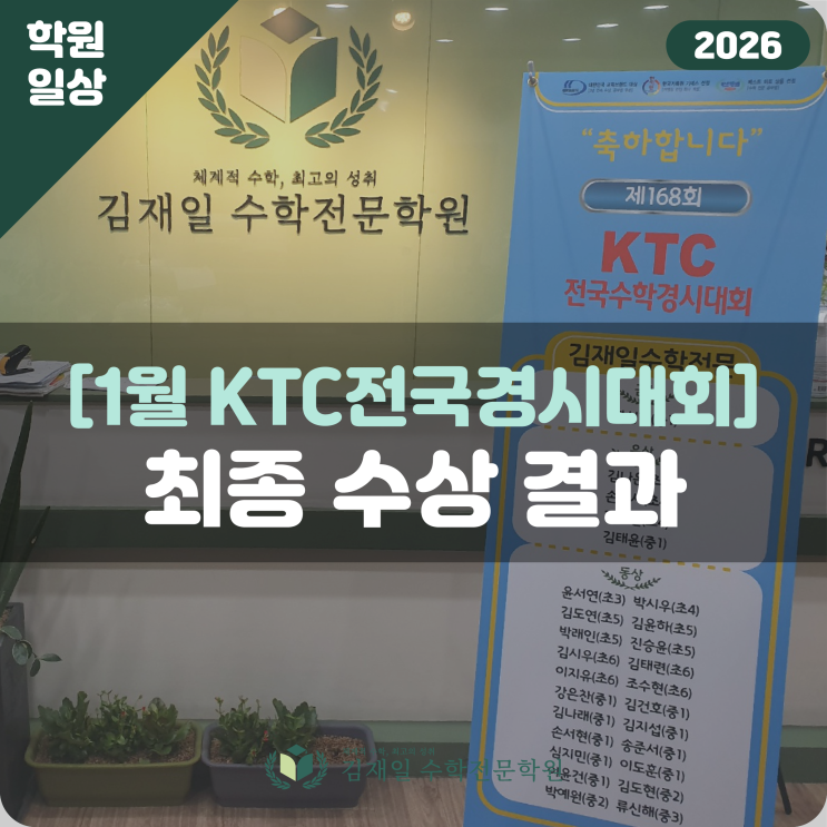 안녕하세요~! 부산 거제동/ 사직동/ 체계적 수학, 최고의 성취! 김재일수학전문학원입니다! 이번 포스팅에는 2026년 새 해의 첫 번째 수상 소식으로 1월 KTC전국수학경시대회 수상 결과를 들고 왔는데요. 과연 어떤 학생들이 뛰어난 실력으로 올해 첫 대회에서 값진 성과를 이루어냈는지 지금부터 함께 확인해보도록 하겠습니다:) 소개에 앞서, 새 해를 맞아 KTC전국수학경시대회에 대해서 간단히 설명드리겠습니다~! [KTC 전국수학경시대회란?] 1. 수학 영재의 발굴과 미래 인재 양성 2. 창의적인 수학 문제 해결에 대한 도전과 수학 영재성 신장 3. 전국 규모의 경시대회로 과학적인 평가 분석을 통한 수학교육의 올바른 방향 제시 KTC전국수학....... <img src="https://blogthumb.pstatic.net/MjAyNjAxMTRfMzkg/MDAxNzY4MzIxMzUzODc0.W-wW9iep3jEMFDQK-sUpO714eqZNMLeHD0GH2Ex-RSEg.D20YRdUHGe1N6qFEGb5sEa3JPDFy10L44Gytf0c72U0g.PNG/%C0%DA%BB%EA_1323x.png?type=s3" />
