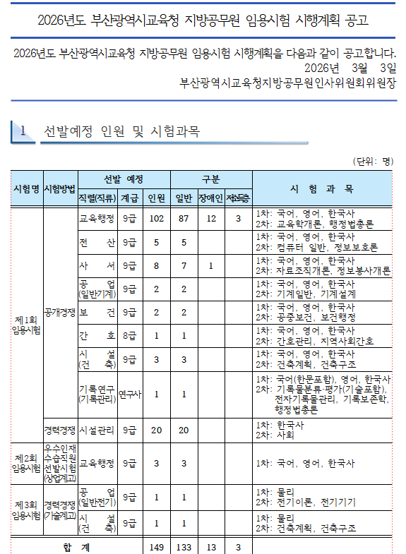 안녕하세요! 공시생 여러분의 가장 든든한 합격 페이스메이커, 커넥츠프랩 부산덕천점입니다. ♂️♀️ 워라밸이 좋고 근무 환경이 쾌적하여 공시생들 사이에서 언제나 1순위로 꼽히는 교육행정직(교행직)! 우리 부산 지역에서 교행직을 준비하고 계신 수험생 여러분, 다들 흔들림 없이 열공하고 계신가요? 목표가 뚜렷할수록 합격에 다가가는 속도도 빨라지는 법이죠. 오늘은 여러분의 가슴을 다시 한번 뛰게 할 중요한 소식을 들고 왔습니다. 2026년 부산광역시교육청 시험 공고 및 TO 부산 교행직을 준비하시는 분들이 가장 기다리셨을 바로 그 소식! [2026년도 부산광역시교육청 지방공무원 임용시험 시행계획 공고]가 발표되었습니....... <img src="https://blogthumb.pstatic.net/MjAyNjAzMTRfNTIg/MDAxNzczNDQ4MTUzODMz.YYzUjuAttCZ8Iu4YCAGXy4ja4drLYYzjrcM88ePR1kYg.iVJTDmKJMDFOjlgh7mi4GktwUuq7GpeR2Z5_YNpUJjkg.PNG/image.png?type=s3" />