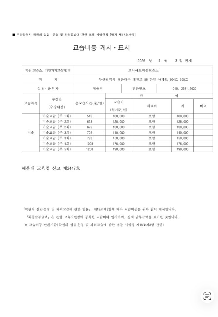 주1회 수업으로 한달 17만원입니다. 주3회로 할 경우 한달 12회 32만원입니다. 4세~7세를 위한 미술흥미유발 프로그램입니다. 날씨도 풀렸고 아이와 함께 미술놀이하며 바깥활동을 시작하셔도 좋을 듯합니다. 저 과정을 통해 아동이 미술에 흥미를 가진 후에 본격적으로 레츠그릿의 미술수업을 들으시면 효과적입니다. 레츠그릿미술놀이학원 051-747-0469 <img src="https://blogthumb.pstatic.net/MjAyNjA0MDJfMTM1/MDAxNzc1MDkyNTI2NTgy.Zgat9KIETXWdnxVSXXE50lBLlLwhjFsPxNJdg3zxdagg.VV3NpvEF_B647TgUjenMdPOYPYOWuAtvuRFz5vCoAHsg.JPEG/KakaoTalk_20260402_100232532.jpg?type=s3" />