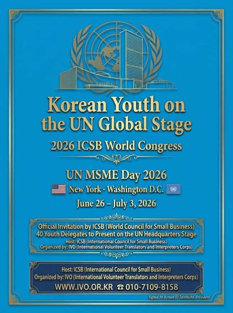 안녕하세요 :) 서울 대치동과 부산 센텀에 위치한 아크 영어학원입니다. 초등 고학년부터 중·고등학생까지 영어 스피치 경험이나 국제 활동을 고민하고 계신 학부모님들께 한 번쯤 참고해보실 만한 프로그램 " 2026년 ICSB 제71회 세계대회 청소년 대표단 모집 " 을 소개드립니다 ! ICSB 세계대회 청소년 대표단 이번 프로그램은 ICSB 제71회 세계대회 청소년 대표단 파견입니다. ICSB는 1955년에 설립된 국제 학술 단체로 기업가정신을 주제로 매년 세계대회를 개최하고 있으며 71개국이 참여하는 글로벌 컨퍼런스입니다. ✈️ 일정과 구성 일정: 2026년 6월 25일 ~ 7월 4일 장소: 뉴욕 & 워싱턴 D.C. 인원: 청소년 대표단 4....... <img src="https://blogthumb.pstatic.net/MjAyNjAzMjdfMjQ2/MDAxNzc0NTM4MTEwMTIx.dbPCWX-8aTqP5J7GOV3jQaN93HAiv_2vp1KnMvZZ6wQg.aUKiJT4te1xmJzGRDvLmYXJVJL4K43F-98YMc7DfSSEg.JPEG/409bf8c3076254c7cf998f050d149f17_H0miFI5M_7a97fd25d15e564511059bc5740146f523.jpg?type=s3" />