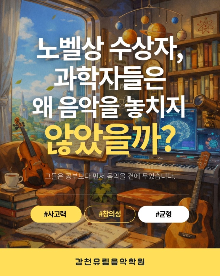 음악은 취미가 아니라 사고를 키우는 언어입니다. 아인슈타인과 노벨상 수상자들이 음악을 곁에 둔 이유, 아이의 사고력이 자라는 음악교육의 본질을 이야기합니다. 왜 그렇게 많은 과학자와 노벨상 수상자들은 평생 음악을 곁에 두었을까요? 이 질문에서 음악교육의 본질은 시작됩니다. 알베르트 아인슈타인은 “인생의 기쁨 대부분은 음악에서 왔다"라고 말하며 연구 중에도 바이올린을 연주했습니다. 막스 플랑크 역시 젊은 시절 음악가의 길을 고민할 만큼 깊이 음악을 공부한 과학자였습니다. 그들에게 음악은 단순한 취미나 특기가 아니었습니다. 복잡한 사고를 정리하고, 보이지 않는 구조를 느끼게 하는 사고의 언어였기....... <img src="https://blogthumb.pstatic.net/MjAyNjAyMDVfMTU0/MDAxNzcwMjczOTUyNzY0.2GmUS8m9P2mllfi_kQqeAnCM_lkhf-8GJ186fDulqaYg.M1_70Hii384PRUQbI3kw32isNnYk5q9CCsXDRo5hlasg.JPEG/900%A3%DF1770218825824.jpg?type=s3" />