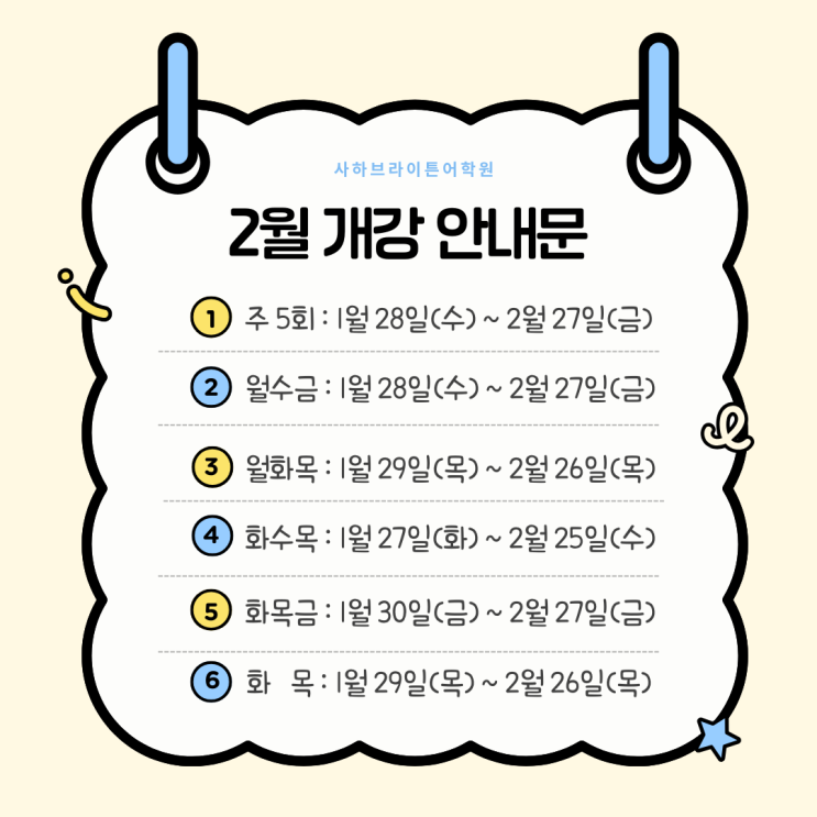 2026년 2월 사하브라이튼 어학원의 개강 안내문입니다. ⭐ 저희 학원의 개강일과 종강일은 주5회는 20회, 주3회는 12회, 주 2회는 8회 수업을 원칙으로 이루어집니다. 이제 한 학기의 마지막을 달려가는 우리 브라이튼 친구들, 모두 수고 많았습니다~^^ ✍ 이번 달은 그동안 열심히 공부한 만큼 즐거운 결실을 맺는 달이죠. 2월 12일(목) ~ 13일(금)에 마켓데이가 있으니 모두 함께 합시다! 그리고 초등 고학년들은 새학기를 맞이하기 전 학습한 문법을 정리하는 테스트가 있는데 화이팅이에요~! <img src="https://blogthumb.pstatic.net/MjAyNjAyMDVfMjE5/MDAxNzcwMjkwNDc1Mjgx.6cpN73hPq0pnKHSyTtJv7rI5SWzIFnsc7ypwrp5wuokg.Dqo7FqQWYJEvz7fnIucteoulwZeI3j0Y1S6Lh_EI6Mgg.PNG/2026_2%BF%F9_%B0%B3%B0%AD%B9%AE.png?type=s3" />