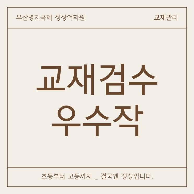 안녕하세요. 정상어학원 부산명지국제분원입니다. 학원의 수업 퀄리티는 단순히 강의력만으로 결정되지 않습니다. 그 기반이 되는 것은 바로 철저한 교재 관리와 꼼꼼한 검수 과정입니다. 저희 분원에서는 매달 정기적으로 교재검수를 진행하며 학생들의 학습 상태와 수업 완성도를 체계적으로 관리하고 있습니다. 초등부부터 중등부까지, 체계적으로 확인합니다 ✔️ 교재는 곧 학생의 학습 결과입니다 교재는 단순한 문제집이 아니라 학생의 학습 과정이 그대로 담긴 기록이자 결과물입니다. 특히 학부모님께 보여지는 교재는 선생님의 수업 관리와 피드백 수준을 보여주는 중요한 기준이 되기 때문에, 더욱 꼼꼼한 관리가 필요합니다. 정상어....... <img src="https://blogthumb.pstatic.net/MjAyNjA0MDZfMTk5/MDAxNzc1NDY0NDkxMjQz.gsJwxcg-17OAn9tFRzPOryqKA5ghi3G45CxRc9XwEdUg.3dq9hBxfo3r4fVlcPunshjwmfoB-ayDUKgFgVWOdZO8g.PNG/%B1%B3%C0%E7%B0%CB%BC%F6.png?type=s3" />