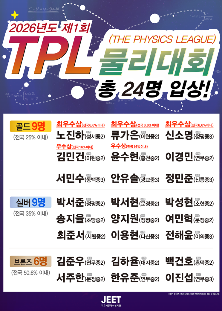 2026년도 제1회 한국중학생물리대회 TPL 에서 "총 24명 입상"을 했습니다. 학생들 입상 축하합니다!!! <img src="https://blogthumb.pstatic.net/MjAyNjA0MDZfOTEg/MDAxNzc1NDczNTU4Mjk3.nPVzo30KlanTab0TGV7-zW3j-wdiiMgIynFGx1283Gog.UTH6JQEGT2Jm3bve7h9WegGkOlU5rA1tRpq2MzKvbz8g.PNG/2026%B3%E2%B5%B5_1%C8%B8_%B9%B0%B8%AE%B4%EB%C8%B8_%C0%D4%BB%F3%C0%DA_%C6%F7%BD%BA%C5%CD%28550X770%29_h_260406.png?type=s3" />