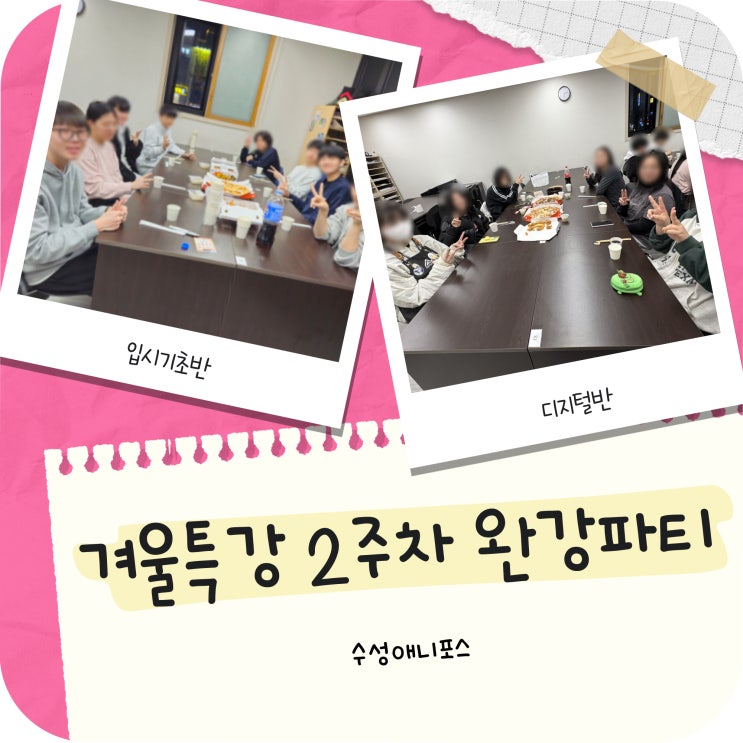 안녕하세요! 수성 애니포스 만화학원입니다. 오늘은 겨울방학 특강 2주차 완강파티 현장입니다. 1월5일부터 1월16일까지 총 10일간 입시기초반,디지털반 특강이 진행되었는데요~ 방학기간동안 열심히 방학 중에도 쉬지 않고 그림에 열정을 쏟은 친구들을 위해 완강 파티를 준비했어요! 맛있는 치킨 피자 떡볶이 삼종 세트를 준비했습니다~~ 2주동안 멋진 작업물을 남겨준 수성애니포스 친구들 수고하셨습니다~ 3-4주차 특강도 파이팅입니다! 감사합니다 오늘 소식은 여기까지입니다. 다음에 또 새로운 소식으로 찾아뵐게요! 상담이 필요하시다면, 학원으로 편하게 문의주세요:) [수성 애니포스] 053-743-6071 <img src="https://blogthumb.pstatic.net/MjAyNjAxMTlfMTA0/MDAxNzY4ODI2MjM4Mjgw.IPiGKJosTzgs9puw9UHFrVa-3xNYTAe7eCU_knafhMUg.gieezUixft-Yzri5FRxGHeJVSuObV1Yer_C9NIFcidcg.JPEG/%B9%AB%C1%F6_%BD%E6%B3%D7%C0%CF.jpg?type=s3" />