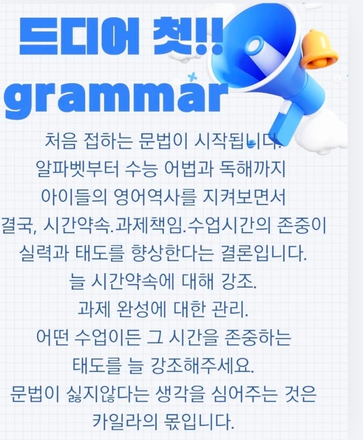 다음주 화요일은 꼬꼬마 아기들의 문법수업이 시작되는 날입니다. 카일라를 졸업한 고등 아이들이 칭찬받는다고 연락이 오는 포인트는 1.읽기 속도 2.발음 3.문법 입니다 문법수업은 흥미를 유발하기 위해 카일라의 연극적 요소가 들어갑니다 (대학 때 극단 활동이 이렇게 도움이 될 줄이야) 그래서 성실하기만 하면!! 태생적으로 공부를 싫어하지만 않으면!! 영문법을 제대로 마스터 하도록 지도합니다. 자~~ 한동안은 힘들어 할 수도 있습니다. 그것은 국어적 어려움 때문입니다. 이제 초4는 부모님과 천천히 공부 이외의 대화를 오래해야하는 시기입니다. 뭐해라!!뭐했어? 이런 대화말고 오늘 있었던 엄마 아빠의 감정이나 일상등을 나누....... <img src="https://blogthumb.pstatic.net/MjAyNjAzMDZfMTMg/MDAxNzcyNzU4MTc2NDE2.3s50_lxuMiPul5fjOTlOBedUol6-CTeKAAmRNptDjtwg.htdX_2G9WM1uTopc_5nWm1IjcurrzvDttCJLcDiU66wg.JPEG/900%A3%DFScreenshot%A3%DF20260306%A3%DF093807%A3%DFCanva.jpg?type=s3" />