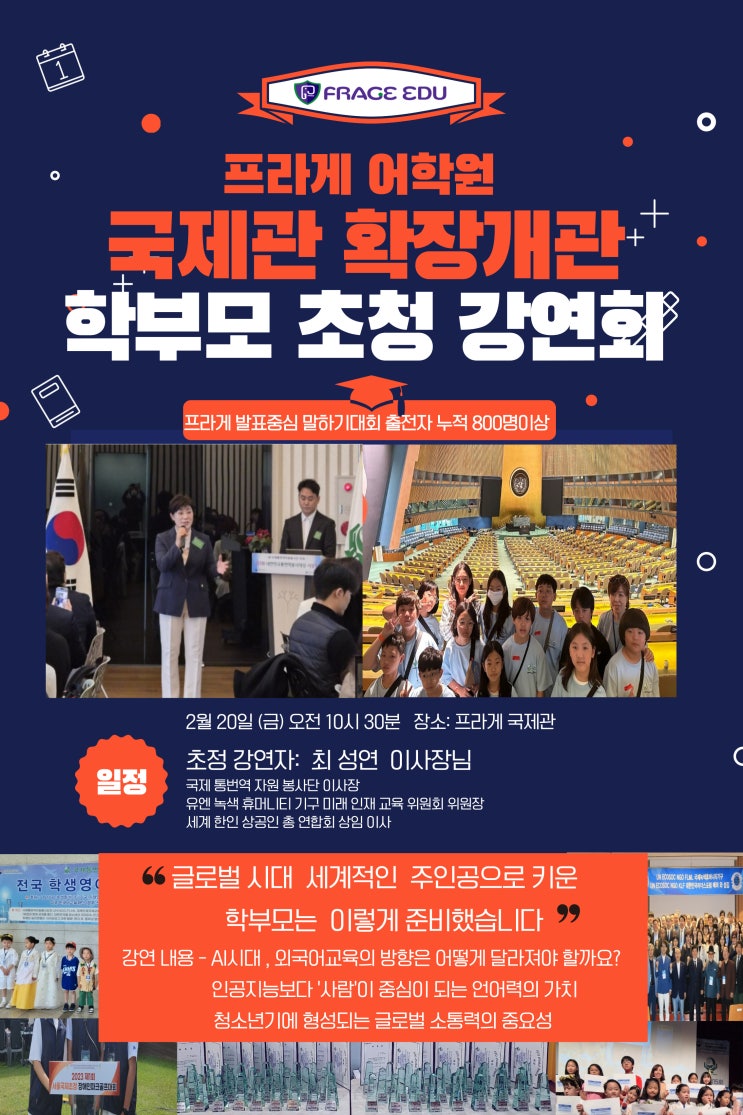 프라게 국제관 오픈 기념 특별 강연회 안내 국제통번역자원봉사단 최성연 단장 초청 2025년 2월, 프라게 어학원은 앤도버관 개관에 이어 영어유치부와 영어유치부 졸업생만을 위한 심화된 글로벌 인재교육을 위한 국제관 확장 개관을 기념하여 유치부터 초등 중등 학부모님들을 위한 특별한 강연회를 준비했습니다. 이번 강연은 단순한 학습 설명회가 아닙니다. AI 시대를 살아갈 우리 아이들이 ‘어떤 언어 능력’을 갖춰야 하는지,그리고 부모가 지금 무엇을 준비해 주어야 하는지를 현장에서 직접 검증된 시각으로 짚어보는 시간입니다. ✔ 왜 ‘국제통번역자원봉사단’ 강연인가요? http://www.ivo.or.kr/ 국제통번역자원봉사단은 국제회의, ....... <img src="https://blogthumb.pstatic.net/MjAyNjAyMDhfNDcg/MDAxNzcwNTYyNjQ5Njcz.hD3WczR_qgLBTDtvE-f432Jq9Px0g2SD8PZ3i8EnIsMg.fA1HlXKI9SQbPc-CknkkbdQJmENjQ30_fGN_A7FRpgog.JPEG/%BC%BC%B0%E8%C3%A2%C0%C7%B7%C2%BF%C3%B8%B2%C7%C7%BE%C6%B5%E5_%BA%B9%BB%E7%BA%BB-001_%281%29.jpg?type=s3" />