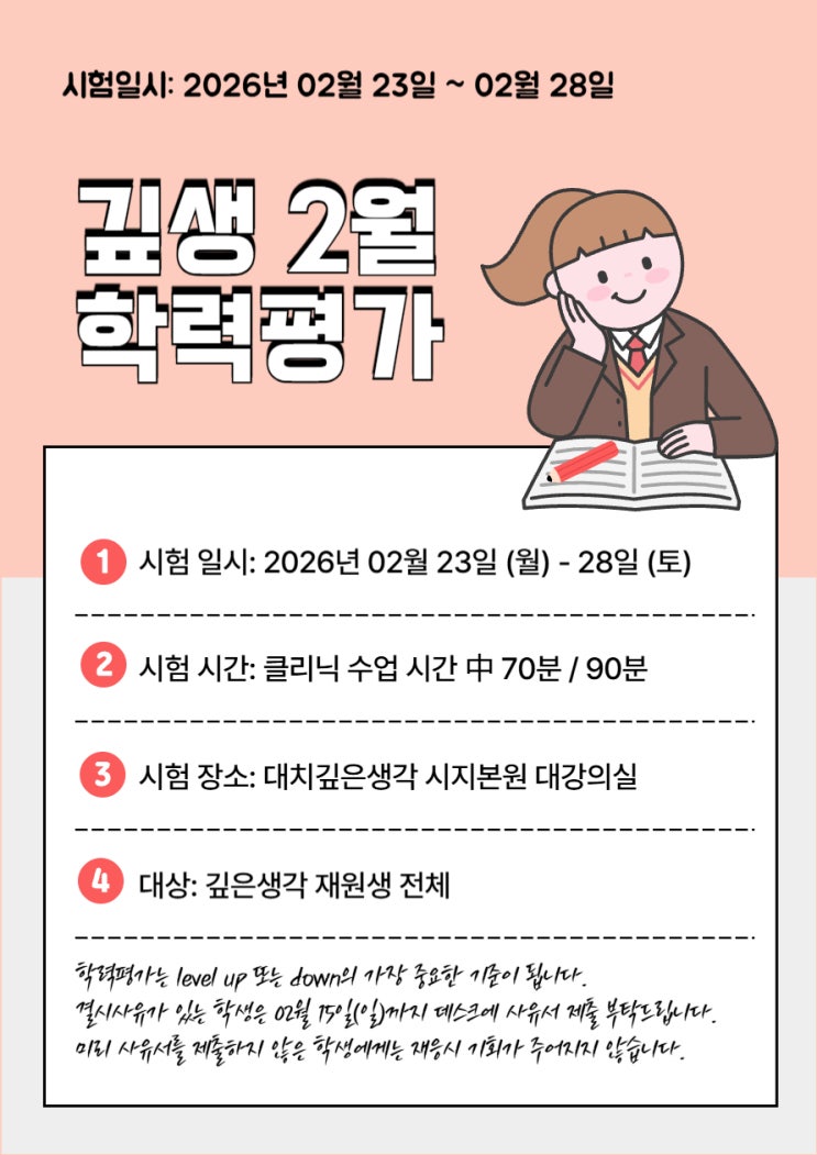 안녕하세요 깊은생각 수학학원 대구시지본원입니다. 재원생을 대상으로 실시하는 2월 학력평가 안내드립니다. 어느덧 새 학기! 새 시작을 앞두고 있습니다. 셀렘 가득한 3월을 앞두고 늘 그랬던 것처럼 새 마음가짐으로 최선을 다해줄 것을 응원합니다. 매 순간이 힘든 시간의 연속이지만, 열심히 잘 따라와 준 학생들에게 진심 어린 칭찬과 격려를 보냅니다. 현재 학습방향에 맞춰 전체 학습의 점검과 레벨업을 위한 2026년 1분기 학력평가를 진행합니다. 2월 학력평가는 2월 23일(월) - 28일(토)에 시행됩니다. 이 인증평가 시험을 통과해야 다음 과정을 이수할 수 있습니다. 우리 학생들의 좋은 결과를 기대하며, 특히 평소에 잘 정리해왔던 개....... <img src="https://blogthumb.pstatic.net/MjAyNjAyMDlfMjUy/MDAxNzcwNjM3OTE3ODU1.rgu6DQvBLwiztMuv2OnFbKxJ_0n8UPZp-S8P4H6hq-sg.4Kq8Fqlz3HfN1pFXbJKqLYccNVu371jh-yg9vw9kIBkg.JPEG/2026_02_%C7%D0%B7%C2%C6%F2%B0%A1-001.jpg?type=s3" />