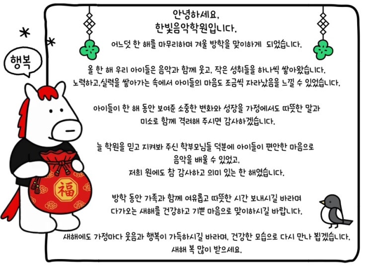 안녕하세요, 한빛음악학원입니다 어느덧 한 해를 마무리하며 겨울 방학을 맞이하게 되었습니다. 올 한 해 우리 아이들은 음악과 함께 웃고, 작은 성취들을 하나씩 쌓아왔습니다. 노력하고, 실력을 쌓아가는 속에서 아이들의 마음도 조금씩 자라났음을 느낄 수 있었습니다. 아이들이 한 해 동안 보여준 소중한 변화와 성장을 가정에서도 따뜻한 말과 미소로 함께 격려해 주시면 감사하겠습니다. 늘 학원을 믿고 지켜봐 주신 학부모님들 덕분에 아이들이 편안한 마음으로 음악을 배울 수 있었고 저희 원에도 참 감사하고 의미 있는 한 해였습니다. 방학 동안 가족과 함께 여유롭고 따뜻한 시간 보내시길 바라며 다가오는 새해를 건강하고 기쁜....... <img src="https://blogthumb.pstatic.net/MjAyNTEyMjdfMjc3/MDAxNzY2ODMxMDA3ODk5.W14HHZaxLp4JwAgoQMdSegNKRhOlOCghC74Jcxb7rtgg.0j815YpClQ0lSyb5rwheHrKZU8BFMKgw1HaAJtgGlyQg.JPEG/IMG%A3%DF0720.JPG?type=s3" />