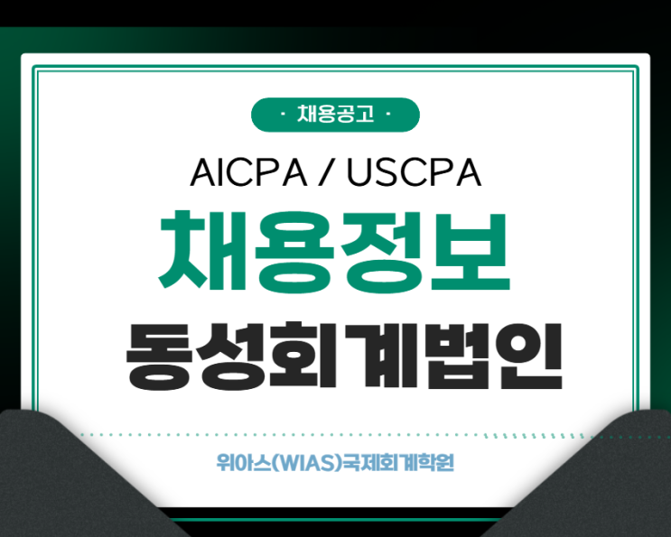 AICPA 채용공고 안녕하세요~ 위아스(WIAS)국제회계학원 입니다. 아래와 같은 채용공고문이 있어서 안내드립니다. 사람인 홈페이지에서 발췌하였습니다. 회사명: 동성회계법인 모집부문: Payroll 및 Accountant (정규직 전환형) 모집 기간: 상시채용 (해당공고는 지원 현황에 따라 조기마감 될수도 있습니다) 자격조건: 대졸(4년제) 이상 (예정자 가능) 근무형태: 정규직, 계약직 근무위치: 서울 서초구 강남대로 221, 4층 408호 자세한 사항은 아래 링크를 참고해주세요 : ) ▼▼▼▼▼ AICPA 상담 위아스학원은 AICPA시험 합격을 위한 유능한 강사님들과 체계적인 커리큘럼을 보유하고 있습니다. 보통 AICPA 시험합격을 위해서는 종합반 강의를....... <img src="https://blogthumb.pstatic.net/MjAyNjAyMjhfNyAg/MDAxNzcyMjQ3ODQxNDUz.ZNPSgM4UbPhq4829LC_BtxBy-Ig5KiHtavqQtIRAp6Ag.le68zvUJ5EkmOpDwmFnhtKWX-JmZ9S1Mx6g4SzztllAg.PNG/image.png?type=s3" />