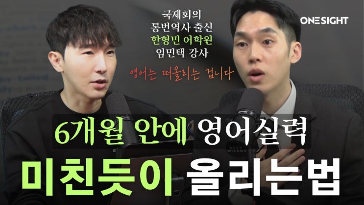 6개월 만에 영어 실력 미친 듯이 올리는 법? 국제회의 통번역사 출신 임민택 강사가 답을 드립니다. "영어는 한국어로 해석하는 게 아닙니다. 상황을 '떠올리는' 겁니다." 최근 핫한 유튜브 채널 <원샷인사이트>에 아주 반가운 얼굴이 등장했습니다. 바로 우리 한형민어학원의 실력파, 국제회의 통번역사 출신 임민택 강사님인데요! '6개월 안에 영어 실력 미친 듯이 올리는 법'이라는 파격적인 주제로 진행된 이번 인터뷰에서, 강사님은 수년간 영어를 공부해도 입이 떨어지지 않는 한국인들의 고질적인 문제점을 정확하게 짚어냈습니다. 그리고 그 돌파구로 우리 학원이 가장 강조하는 훈련 철학을 명쾌하....... <img src="https://blogthumb.pstatic.net/MjAyNjAzMThfMjMx/MDAxNzczNzk3MTkzMDE4.nyIjPjp1IPog0jeErpdTndgEUcM6inAjiTgkHfmMC2wg.yhFT4wxbcoMRa-eSamil_rRQOuHmolWw6veco5gMmNIg.JPEG/eAY9Pel0tP4.jpg?type=s3" />