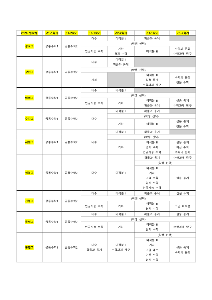 2026년 수지 지역 고등학교 교육과정 편제표 (현 고1 대상)