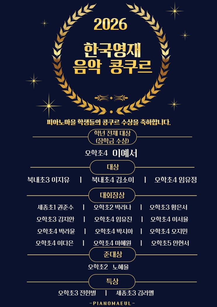 안녕하세요, 피아노마을입니다 최근 열린 전국 학생 음악 콩쿠르과 한국 영재 음악 콩쿠르에서 피아노마을 친구들이 좋은 결과를 얻었습니다. 콩쿨을 준비하며 긴 시간 동안 연습실에서 묵묵히 노력해 온 아이들. 그 과정 속에서 실력뿐 아니라 집중력과 무대 경험까지 한층 더 성장한 모습이었습니다. 결과도 물론 기쁘지만, 무대 위에서 자신 있게 연주하는 모습이 정말 자랑스러웠습니다. 콩쿨 준비 과정 속에서 또 한 번 성장한 우리 피아노마을 콩쿨반 친구들 다시 한 번 축하합니다 앞으로도 아이들의 음악 여정을 피아노마을이 함께하겠습니다.♡ <img src="https://blogthumb.pstatic.net/MjAyNjAzMDlfMTU5/MDAxNzczMDI5ODAwOTgx.cONO8HCXVVLnCOh9iq8L_4Iz2OgbIEbQUAKhLOqnQHkg.CD-lIqfKIf2DSZhQ7zeyZENMN1Xp9TVeHXuRnECsbhcg.JPEG/%BC%F6%BB%F3_%B9%E8%B3%CA_A4_%283%29.jpg?type=s3" />
