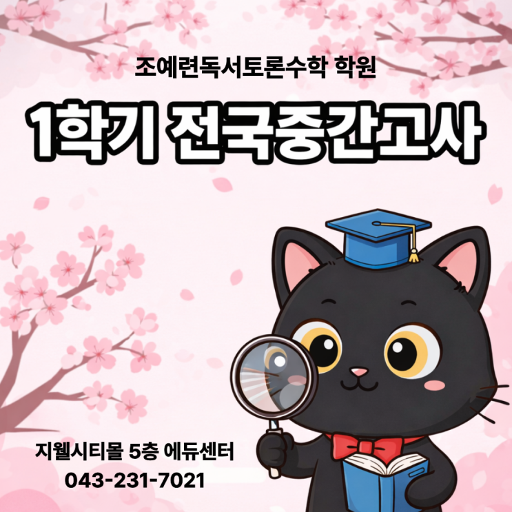 안녕하세요 조예련독서토론수학을 찾아주신 학부모 여러분. 늘 저희 원을 아껴주시고 성원해주심에 깊은 감사의 말씀을 드리며, 이번 년도에도 어김없이 미래엔 수학에서 진행하는 1학기 전국중간고사가 시행됨에 따라 안내를 드리고자 합니다. <2026년 1학기 미래엔수학 전국중간고사 시행 안내> 1) 대상: 초등 1학년 ~중등 3학년, 수학 2) 기간: 4월 17일(금) 오전 10시 ~ 4월 27일(월) 23시 59분 3) 문항: 총 25문항(일반형 20문항, 서술형 5문항) 4) 시험시간: 총 50분 5) 결과발표: 4월 29일(수) 오전 10시 6) 수상 기준: 최우수상-95점 이상~100점 우수상-85점 이상~95점 미만 7) 시험범위 조예련독서토론수학 학원의 소중한 학부모....... <img src="https://blogthumb.pstatic.net/MjAyNjAzMDlfOTQg/MDAxNzcyOTg1ODc3ODEw.H6WVbtw8H-NHDYX6cBtX0rXYuOTdme6sGKwvj960STYg.WmPoAckjuL94Ibt04Ntz4rVS6qowzI7JvHtpomrRzQYg.PNG/%C1%A6%B8%F1%C0%BB_%C0%D4%B7%C2%C7%D8%C1%D6%BC%BC%BF%E4._%283%29.png?type=s3" />