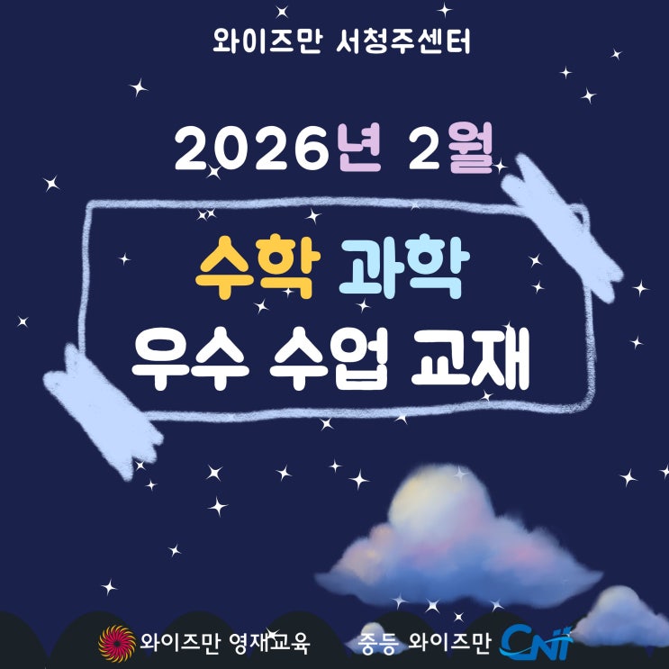 안녕하세요. 와이즈만 서청주센터 입니다. 2월 수업이 마무리되고, 선생님들의 논의 끝에 우수 수업 교재가 선정되어 소개해 드립니다. 우수한 교재가 많아서 1, 2탄으로 나누었습니다. 2026년 2월 수학·과학 우수 수업 교재 Askwhat A단계 1학년 박*준 <바닷속 친구들> 우리가 매년 생일마다 맛있게 먹는 미역, 과연 그 속에는 어떤 과학적 신비가 숨겨져 있을까요? 단순히 먹거리로만 보았던 미역을 관찰, 비교, 추출의 과정을 통해 깊이 있게 탐구해 보았습니다. 미역 특유의 미끌미끌한 성분인 '알긴산'을 직접 추출해서 이 성분이 어떤 성질을 가지고 있는지, 어떻게 쓰이는지 증명해 보았습니다. 관찰력과 분석력이 향상될....... <img src="https://blogthumb.pstatic.net/MjAyNjAzMDRfMTgw/MDAxNzcyNjIzMTI1MTcy.2WWoAtTnCTVs3PMPKqMg0uh97pme8We-nN9uzhUJIvAg.eskrPGwUczLTzKuq5NFLVeuON6Nf1S1ZhwY5PNzdYqMg.JPEG/1.jpg?type=s3" />