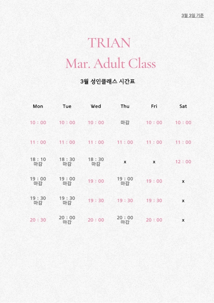 안녕하세요. 트리안음악학원입니다.️ 3월 성인클래스 시간표 ️ 수요일 / 금요일 오후클래스 여유로우니 참고 부탁드립니다 성인 1:1 맞춤형 개인레슨 개인의 성향과 난이도에 맞춘 1:1 개인레슨으로 온전히 나만을 위한 시간으로 채워집니다 입문•초급클래스 - 계이름 읽기, 악보 보기, 양손 독립 등 - 긴 곡 보단 짧은 곡들로 다양한 작품 다룸 - 성인맞춤교재 1•2권 간추려 진행 챌린지 클래스 - 학생 때 배웠는데 재도전하는 수강생 - 기초를 재정비하여 원하는 곡 선택하여 연주 - 뉴에이지, 클래식, 영화•애니메이션 OST 등 아티스트 클래스 - 다양한 작품을 연주해 본 연주자의 클래스 - 전공생들이 다루는 클....... <img src="https://blogthumb.pstatic.net/MjAyNjAzMDZfMjk1/MDAxNzcyNzc1Mjc0NDYw.r7-Thyf-vmmlo-1nUMXttcyNHsyaOiE-tBn5feff3VIg.Ozp0HFnQ2qnr6lNUBoqczJAxy1U5xBjlkl2Y12xvwCUg.JPEG/IMG%A3%DF8086.JPG?type=s3" />