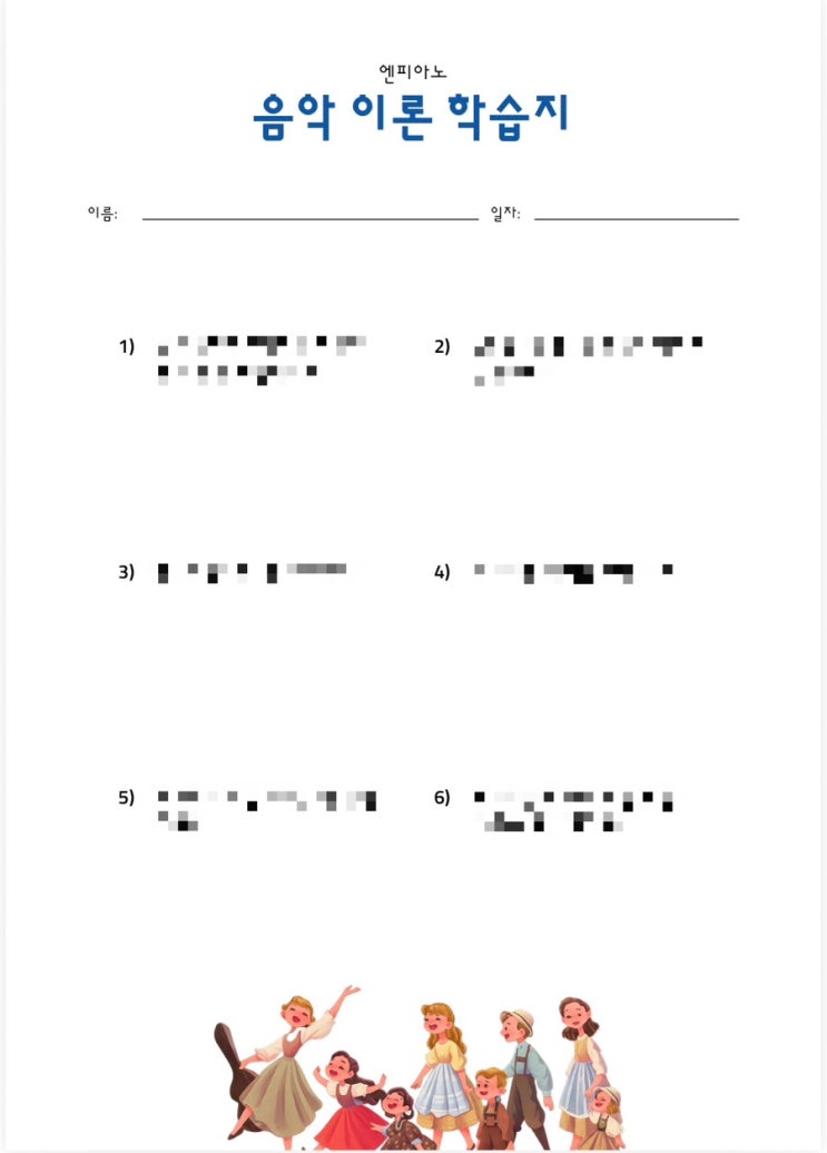 엔피아노는 음악교육을 전공하고 석사 졸업한 원장선생님이 아이들을 생각하며 이론 문제집을 직접 만듭니다. 학교 음악 교과과정에 맞추되, 아이들이 이해하기 쉽게 한 번 더 풀어내고, 연주와 자연스럽게 이어지도록 담아냅니다. <img src="https://blogthumb.pstatic.net/MjAyNjAzMDRfNTIg/MDAxNzcyNjI0ODE1MDYy.zvw8btuwzQU44_-MXv6U_rq8yHxPye5u3eE8pDpRk_og.yPkREP1ZkUsignH9GLYyXKVFf5GlXyk0aQzFDkf79lkg.JPEG/output%A3%DF4207029318.jpg?type=s3" />