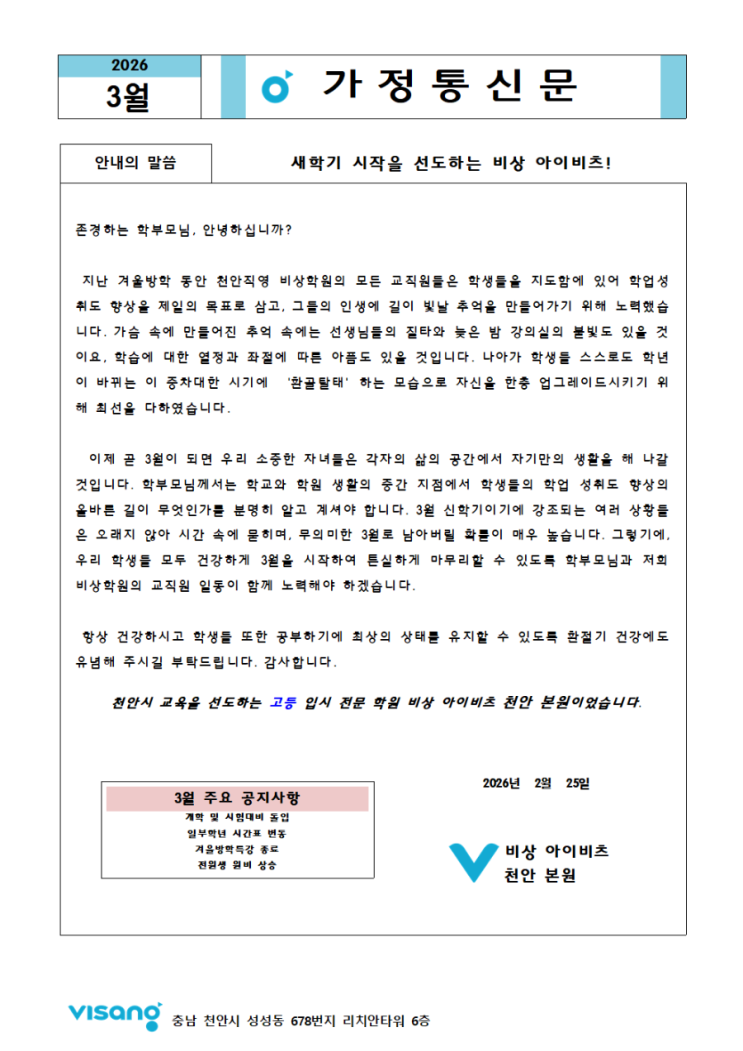 [천안비상아이비츠] 2026년 3월 가정통신문_천안입시학원 고등 입시 중등 입시 고등 선행 중등 선행 영어 입시 수학 입시 국어 입시 천안비상아이비츠