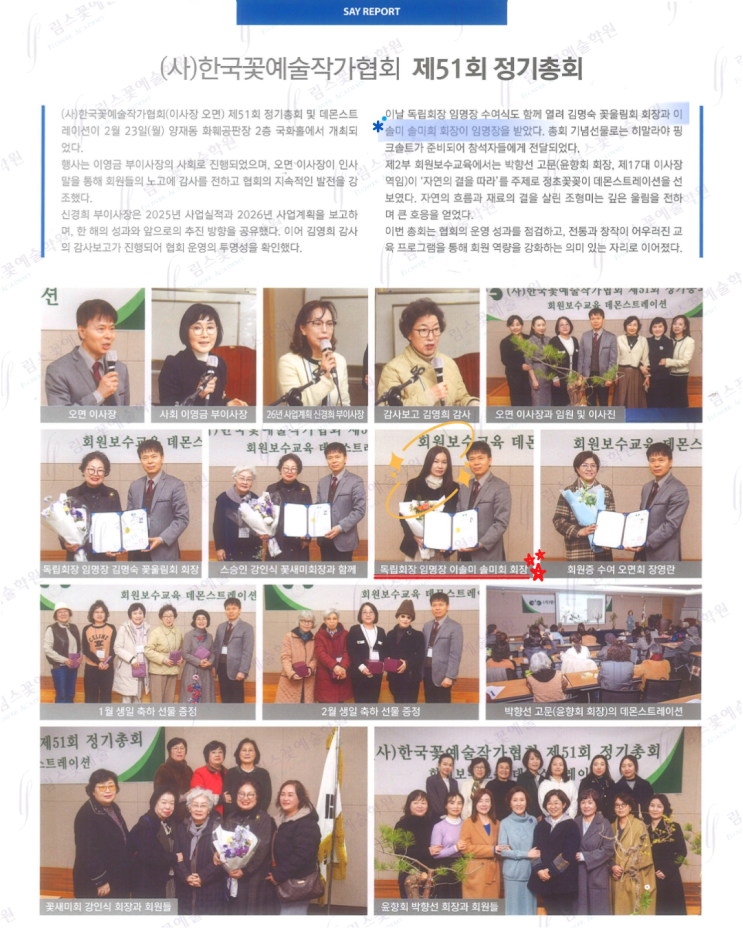 (사)한국꽃예술작가협회 제 51회 정기총회 (사)한국꽃예술작가협회(이사장 오면) 제 51회 정기총회 및 데몬스트레이션이 2월 23일(월) 양재동 화훼공판장 2층 국화홀에서 개최되었다. 행사는 이영금 부이사장의 사회로 진행되었으며, 오면 이사장이 인사말을 통해 회원들의 노고에 감사를 전하고 협회의 지속적인 발전을 강조했다. 신경희 부이사장은 2025년 사업실적과 2026년 사업계획을 보고하며, 한 해의 성과와 앞으로의 추진 방향을 공유했다. 이어 김영희 감사의 감사보고가 진행되어 협회 운영의 투명성을 확인했다. 이날 독립회장 임명장 수여식도 함께 열려 김명숙 꽃울림회 회장과 *ੈ✩‧₊˚이솔미 솔미회 회장이 임명장을 받....... <img src="https://blogthumb.pstatic.net/MjAyNjAzMTNfNTQg/MDAxNzczMzgxMTkxNzUz.PChbDEKlnL4hLpxG9--wejYU6BTmzqooN23LLM4v65sg.VgweCJhr5w5wavrM3TSzihQ0ST0HyFXj-i30nkWV0GUg.PNG/3.png?type=s3" />