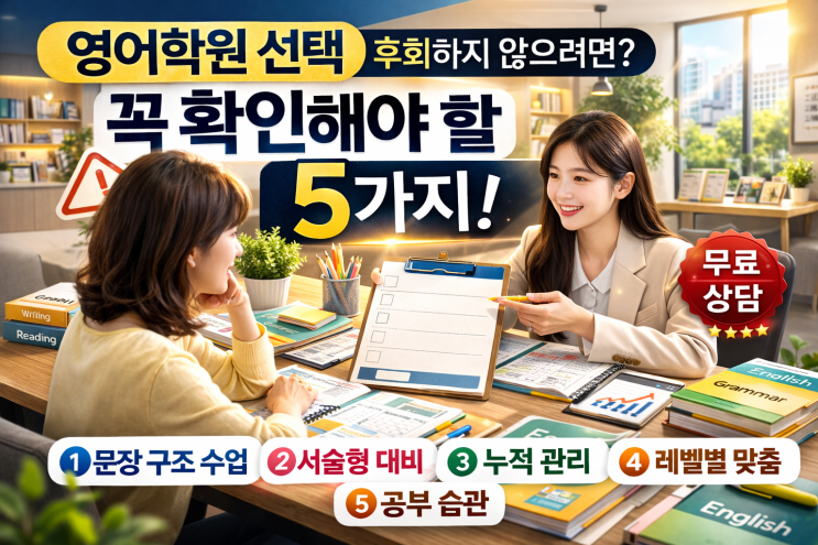 안녕하세요, 루체테어학원 영등포캠퍼스입니다. ^_^ 중등영어학원을 알아보는 학부모님들이 가장 많이 하시는 질문은 이것입니다. 어디가 잘 가르치나요? 하지만 정말 중요한 질문은 따로 있습니다. 우리 아이에게 맞는 시스템인가요? 학원의 간판보다 중요한 것은 수업 구조, 관리 방식, 커리큘럼 체계입니다. 오늘은 중등영어학원 선택 시 반드시 확인해야 할 5가지를 정리해 드립니다. 1️⃣ 단어만 많이 외우는 학원인가요, 문장 구조를 가르치나요? 많은 학원이 단어 암기에 집중합니다. 하지만 내신 영어는 단어만의 싸움이 아닙니다. ✔️ 문장 구조 이해 ✔️ 시제 변화 ✔️ 주어-동사 수 일치 ✔️ 서술형 영작 이 네 가지가 핵심입니....... <img src="https://blogthumb.pstatic.net/MjAyNjAyMjZfMjgy/MDAxNzcyMTAxOTM3NzEx.tU2U4D9UWbyi6_l3gNLwTPdykl8V1V5JZLTVjrxvLPcg.wTRVWL7Ou_Nc5gx164rb_ElG_hY--ymLiQswXz2R2gUg.PNG/ChatGPT_Image_2026%B3%E2_2%BF%F9_26%C0%CF_%BF%C0%C8%C4_07_32_00.png?type=s3" />