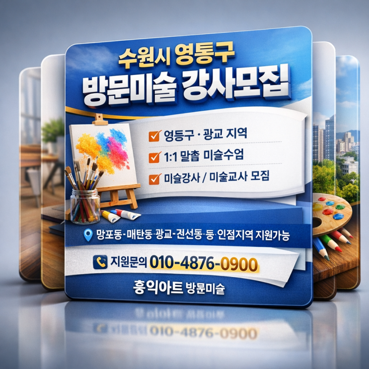수원시 영통구 방문미술 수요가 꾸준히 증가하고 있습니다. 망포동, 매탄동, 원천동, 신동, 광교신도시를 중심으로 회원 문의가 지속적으로 늘어나고 있어 함께 성장할 강사님을 찾고 있습니다. 수원시 영통구 거주 및 인접 지역인 서천지구, 흥덕지구, 영덕동, 서천동 반월동, 권선동, 우만동, 인계동 지원 가능합니다. 거주지 인근 수업배정으로 이동 동선 부담을 최소화할 수 있습니다. 문의 및 간단 상담 010-4876-0900 방문미술 홍익아트 <교사지원바로가기> 홍익아트 방문미술은 단순한 방문 수업이 아닙니다. ✔ 1:1 가정방문 맞춤 수업 ✔ 유아·초등 중심 단계별 커리큘럼 ✔ 장기 회원 관리 중심 구조 아이의 발달 단계와 성....... <img src="https://blogthumb.pstatic.net/MjAyNjAzMDNfMjM1/MDAxNzcyNTM5NjMxMzg3.1N2gqCH7o2eZ7SVK3S7xMc386JjA_STXFwVvHq07t9Eg.DkPYtKMnKPkjjTYOb-HDDdEUSaF3A3qZFrvVzPTPJwQg.PNG/%BF%B5%C5%EB%B1%A4%B1%B3%B9%E6%B9%AE%B9%CC%BC%FA%B0%AD%BB%E7.png?type=s3" />