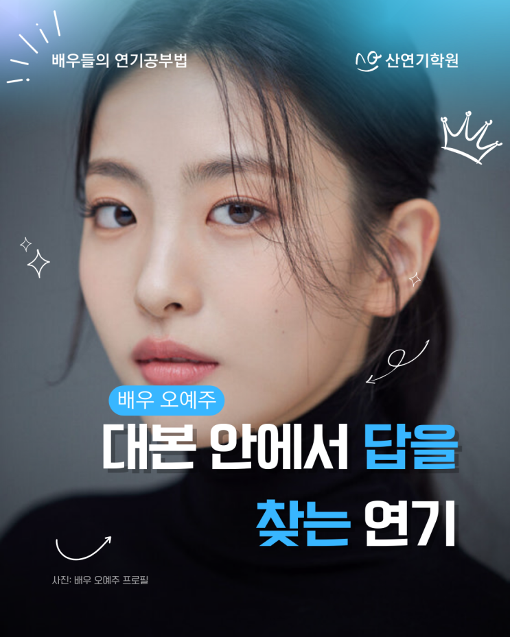 안녕하세요! 산연기학원 입니다. 드라마 슈룹 에서 활약하고 있는 배우 오예주의 연기 공부법에 대해 알아보아요. Q. 연기를 하게 된 계기가 있나요? A. 원래는 디자인에 관심이 있었어요. 그런데 배우 활동을 하면서 자연스럽게 연기를 전공하게 되었죠. 또 여러 교양 과목을 수강하면서 문학에도 제가 흥미가 있다는 걸 알게 됐어요. 언어가 주는 울림들이 저는 굉장히 좋더라고요. 연기 팁: 희곡·소설을 소리 내어 읽어보세요! (묵독이 아니라 반드시 낭독) Q. 오디션을 볼 때 팁이 있을까요? A. 제가 감히 조언할 자격은 없지만, 오디션 경험을 바탕으로 말씀드리자면, 처음부터 너무 겁먹지 않았으면 좋겠어요. 저는 오디션 볼 때, 감독님도....... <img src="https://blogthumb.pstatic.net/MjAyNjAyMjVfMTkw/MDAxNzcxOTkxNzgyNDk2.SPHjQXfoeBkc5RzcAzr_J6L9SWBitFzjL00KFQ4TSUkg.8zwvvvUEULNjNnCpA7zZ6JO8wJ2sqI-TEyWiylarPawg.PNG/1.png?type=s3" />