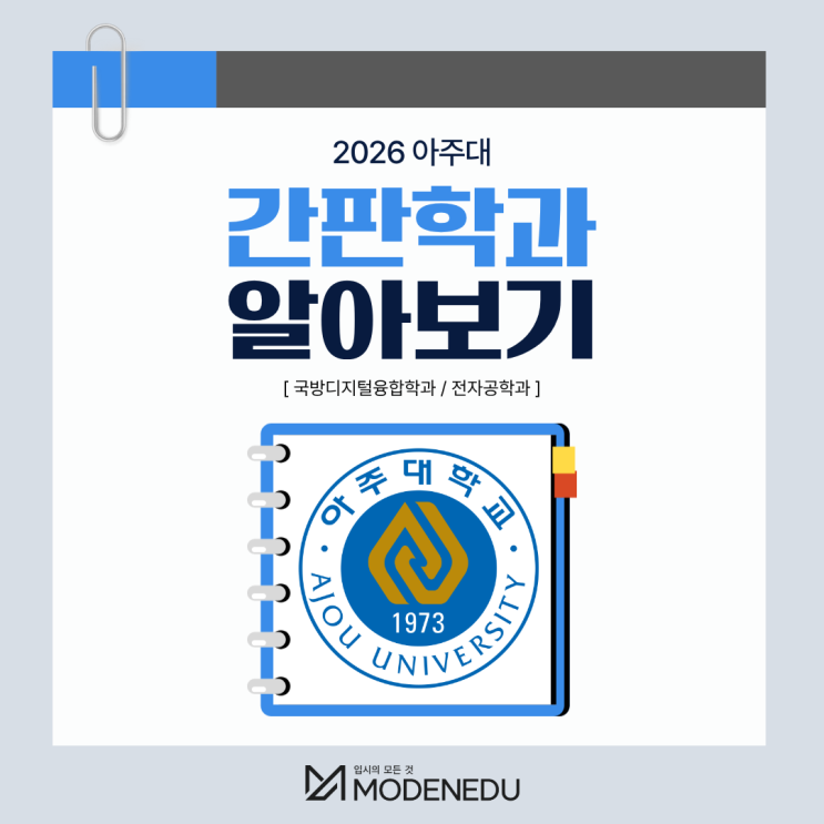 안녕하세요 :) 결과가 다른 입시의 시작 모든에듀케이션입니다. 오늘은 대학별 간판학과 시리즈로 아주대학교 간판학과 국방디지털융합학과와 전자공학과 인기 있는 두 학과를 알아보겠습니다! 아주대학교는 경기도 수원시에 위치한 대한민국의 대표적인 사립 종합대학으로 공학·의학·경영·인문사회 등 다양한 분야에서 실용 중심의 교육과 연구를 진행하고 있으며 산학 협력과 글로벌 역량을 바탕으로 미래 산업을 선도하는 실천형 인재 양성을 목표로 하고 있습니다. 2026 아주대학교 간판학과 알아보기 ※ 객관적인 지표와 함께 주관적인 견해가 포함되어 있습니다. 아주대 국방디지털융합학과와 아주대 전자공학과의 2026학년도 경쟁률을 알....... <img src="https://blogthumb.pstatic.net/MjAyNjAyMjdfNzIg/MDAxNzcyMTc3NTk1NDM3.tnyW5kkytiJCMoCYRqZmFPSGpE_OERhz7JEogjXmos0g.qpmDOR6CJSO2rawacIFQUXzv8-jGyqJ7JvH9mxRe6IYg.PNG/1.png?type=s3" />