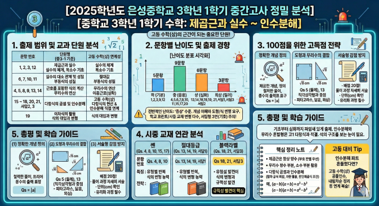 2025학년도 은성중학교 3학년 1학기 중간고사 시험지를 정밀 분석했습니다. 중학교 3학년 1학기 과정(제곱근과 실수 ~ 인수분해) 시험지입니다. 중3-1 과정은 고등 수학(상)의 근간이 되는 매우 중요한 단원입니다. 1. 출제 범위 및 교과 단원 분석 이번 시험은 중등 수학 3학년 1학기 앞부분의 핵심 내용을 모두 포함하고 있습니다. 2. 문항별 난이도 및 출제 경향 (Bar Graph) 전반적인 난이도는 '중상' 수준입니다. 단순 계산력보다는 개념의 정확한 이해와 도형/식의 변형 능력을 요구하는 변별력 문항(13번, 18번, 21번, 서답형)이 곳곳에 배치되어 있습니다. 하 (기본) ■■■■■ (5문항) - 1, 2, 3, 9, 12 중 (응용) ■■■■....... <img src="https://blogthumb.pstatic.net/MjAyNjAzMDNfMTcz/MDAxNzcyNTMwNjE1OTE4.iX8f31EBviQhuTmfLgndVYx9AzP7ih2lUWPrUl70Kz4g.36E4y2A5W_AGdkZfrhe228sg9wsDkK1bpvv9fTjOYFEg.PNG/1.png?type=s3" />
