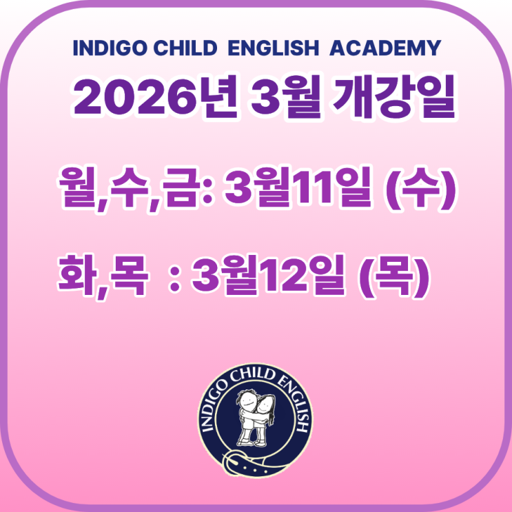 3월, 아이의 영어가 달라지는 시작 인디고차일드 영어학원 2026년 3월 개강 안내 새 학기가 시작되는 3월. 아이들의 가방은 새로워지고, 마음은 조금 설레고, 조금은 긴장됩니다. 그리고 부모님들 마음속에는 이런 질문이 떠오르실 거예요. “이번 학기에는 우리 아이 영어, 제대로 시작할 수 있을까?” 인디고는 그 질문에 **‘읽는 힘부터 다르다’**라고 답합니다. 3월 개강 일정 ✔ 월·수·금반 → 2026년 3월 11일 (수요일) 개강 ✔ 화·목반 → 2026년 3월 12일 (목요일) 개강 유치부 – 영어의 첫 기억을 만드는 시간 영어는 처음 만나는 순간이 중요합니다. 단어를 외우는 시간이 아니라 영어 소리를 듣고, 따라 하고, 읽으....... <img src="https://blogthumb.pstatic.net/MjAyNjAzMDFfMjI2/MDAxNzcyMzU2OTcwNDEx.dnLDFLyyXtqrblJ2X_Bls4y7Cyr3s3t0Irr6G69WfhMg.UTSuDx7SqfIL8Xq_9gabCMGjWPj0_m2_UOiMcNQNAeYg.PNG/%BA%ED%B7%CE%B1%D7%C7%A5%C1%F6_%2810%29.png?type=s3" />