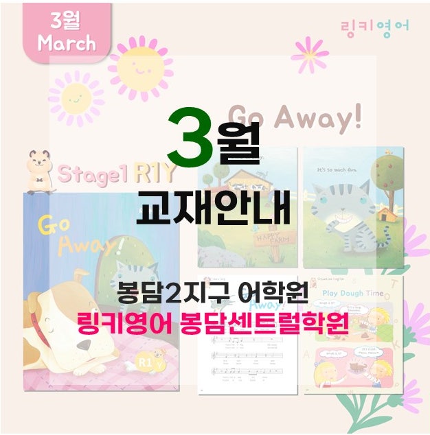 Stage1-1 <Go Away!> 다른 동물들의 울음소리를 copy 하는걸 좋아하는cat 의 이야기 입니다^^ 스토리송도 너무 신나고 개인적으로 3월 교재를 아이들도, 저도 굉장히 좋아합니다~! 동물 이름 및 울음소리 표현을 습득을 하게 됩니 dog / pig / cow / cat / bow-wow / oink-oink / moo-moo / meow-meow / copy / like / go away / come in Stage1-2 <Happy Birthday!> 사자의 생일파티에 초대된 동물 친구들! 다들 sing, dance, cook 등 여러 동작을 하면서 사자의 생일을 축하해주지만 elephant 는 할 줄 아는게 없어 속상해 하는데... 과연 elephant 도 할 수 있는게 있을까요~?^^ 이번 교재 스토리송도 너무너무 신나죠! 한 번 들....... <img src="https://blogthumb.pstatic.net/MjAyNjAzMDVfMTA3/MDAxNzcyNzAwNTY1NTg1.U4qW87uVQzCwJw5evCycjbk6tt0X6wNS_HGMpU80JTkg.EpVMNcWqdAyzaBF3JffBnEtTjdyJGVA2x9Ito2U5ieQg.JPEG/1.jpg?type=s3" />