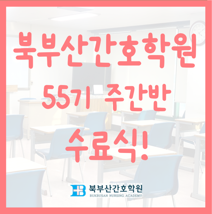 안녕하세요~ 북부산간호학원 입니다! 오늘 3/11 목요일은 55기 수료식을 진행한 날 입니다~ 10개월 동안 모두 수고 많으셨습니다~ 수료식인 만큼 수료증명서와 상장을 수여하였습니다~ 표창장 총 3명 공로상 반장에게 1명 개근상 2명 원장님의 축사말씀도 듣고~ 10개월의 마루리에 대한 소감을 한분씩 나와서 발표하였습니다~ 이것으로 55기 수료식을 모두 마치겠습니다~ <img src="https://blogthumb.pstatic.net/MjAyNjAzMTFfMTE4/MDAxNzczMTk5MTcxMDMx.LMolpZ3j1-TVcRZJWPHvN8myDJMuufCn-oV1nviL7sEg.txkFRBcynFnTbwH24Zc91iSI1jOVDyYFP4uYxrO3Dj8g.PNG/%B1%D7%B8%B21.png?type=s3" />