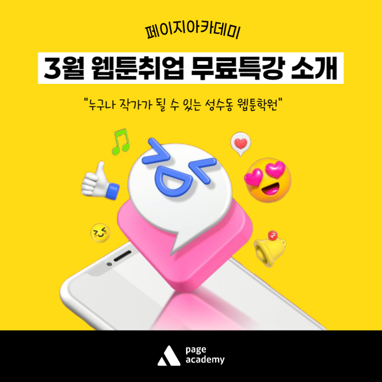 안녕하세요 누구나 작가가 될 수 있는 성수동 웹툰학원 페이지 아카데미입니다! 벌써 2026년의 3월이 다가왔는데요. 3월이 되니 점점 따뜻해지는 날씨와 함께 무언가 새로이 도전해보고 싶은 기분이 드는 것 같아요~ 여러분은 건강히 잘 지내고 계신가요~? 오늘은 페이지아카데미에서 웹툰업계로 취업을 희망하는 많은 분들을 위해 ‘3/26 토요일’에 진행되는 무료특강에 대해 소개해드려볼까 해요! 취업에 많은 도움이 되는 알찬 내용들로 꾸며보았으니 웹툰업계 취업을 희망하신다면 꼭 신청해서 많은 정보 얻어가시길 바랄게요~ 페이지아카데미 웹툰 취업 무료특강 요즘 페이지아카데미로 문의주시는 수강생분들 중 가장 많은 비율을 차....... <img src="https://blogthumb.pstatic.net/MjAyNjAzMTNfMjQ4/MDAxNzczMzcyMzk1MTE0.oakCM1MdXVLG4Jc2r_VoC8K-ifC3S6OOi23yuMY1H90g.zNrYQXPWFMRV6_4do1B9JdL2xzzyZNNTqmsL4hCCYb4g.PNG/%BC%BA%BC%F6%B5%BF_%C0%A5%C5%F7%C7%D0%BF%F8-001_%285%29.png?type=s3" />