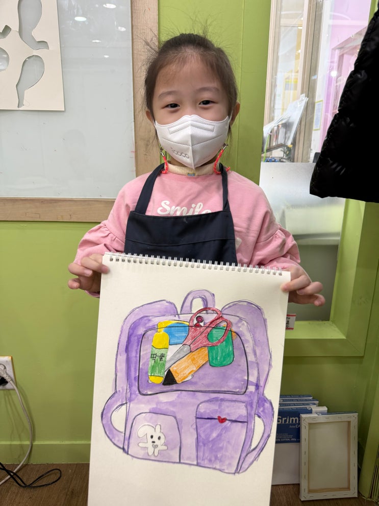 이번 수업에서는 신학기를 맞이하여 초1,2 아이들의 눈높이에 맞춰 매일 사용할 가방을 하나의 '정물'로 바라보며 관찰하는 재미를 느끼는 정물화 그리기 수업을 진행했습니다. "내 가방 속에는 뭐가 있을까?"라는 질문으로 수업을 시작하며, 필기구, 미술재료, 물통 등 아이들이 실제로 가방에 넣고 다니는 물건들을 하나씩 떠올려 보았습니다. 먼저 가방의 겉모습을 천천히 살펴보며 모양과 크기, 손잡이와 지퍼의 위치를 실제와 비슷하게 그렸습니다. 가방의 열리는 앞부분 큰 주머니 부분만 OHP필름으로 투명하게 표현해 안에 들어있는 물건이 보이도록 했습니다. 가방의 구조와 안·밖의 개념을 자연스럽게 이해해볼 수....... <img src="https://blogthumb.pstatic.net/MjAyNjAzMDJfNDYg/MDAxNzcyNDU3ODI0ODc5.MXLU5_CJmoGRXuxm0x2D8R2dSnCKH3yCj3p5S1nsm6Mg.vIVc9LBv0VVmgBqIRbT39mS--VYoYyZGHNrpVNVP5f8g.JPEG/KakaoTalk_20260302_221230975_20.jpg?type=s3" />