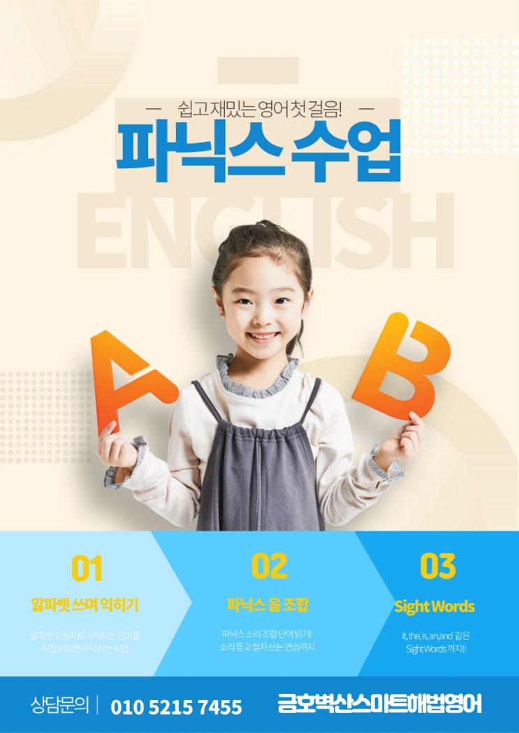 안녕하세요, 금호동 영어학원 금호벽산스마트해법영어 원장 라온허쌤입니다. 우리 아이 영어 공부의 시작, 파닉스 수업을 어디서 시작해야 할지 고민이 참 많으시지요? 저 역시 두 아들을 키우며 '어떻게 하면 영어를 공부가 아닌 즐거운 언어로 받아들일 수 있을까'를 수없이 고민했던 엄마이기에 그 간절함을 누구보다 잘 알고 있습니다. 단순히 ABC를 외우는 것을 넘어, 소리의 원리를 깨우치고 스스로 단어를 읽어내는 기쁨을 선물하고 싶습니다. 오늘 이 글에서는 우리 아이들의 영어 자신감을 결정짓는 파닉스 학습법과 새롭게 개강하는 신규반 소식을 상세히 전해드리려 합니다. 초등 영어 시작이 막막하셨다면 이 글이 명쾌한....... <img src="https://blogthumb.pstatic.net/MjAyNjAzMTZfMTc3/MDAxNzczNjcxMzk2ODMy.pGUnziACttZj2fDbv-dwW-o4mmIYVpI-l2xqomdrs7Ug.Mk65d_0CGgC_lQ0Op9n1mA2ms7Yf6Pk5N1iaApnIgSMg.JPEG/900%A3%DF%C1%A6%B8%F1%C0%BB%A3%DF%C0%D4%B7%C2%C7%D8%C1%D6%BC%BC%BF%E4.%A3%A83%A3%A9.jpg?type=s3" />