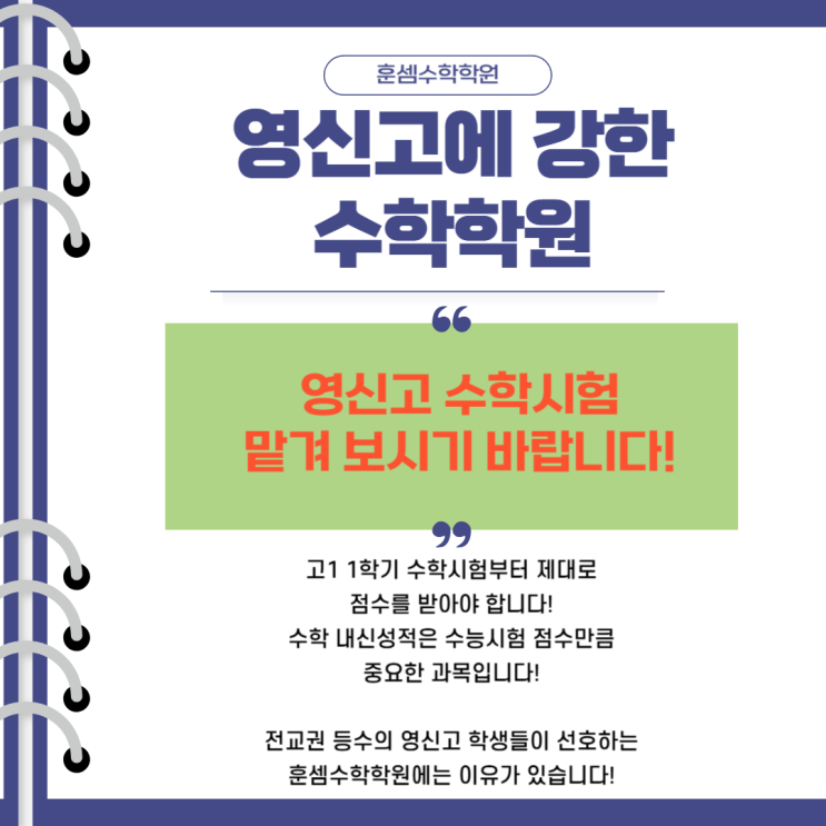 안녕하세요 영신고 수학학원 훈셈수학학원입니다!! 고등부에 올라온 우리 학생들은 이제 1학년이니까 아직 시간이 많이 남았다고 생각합니다! 하지만 수학의 기초가 제대로 잡혀있지 않은 학생들에게는 그렇게 많은 시간이 없다는 사실을 꼭 명심해야 한다고 말합니다! 고등학교 1학년 1학기부터 3학년 1학기까지 5학기가 바로 내신시험을 반영하는 학기입니다. 근데 수학은 기초가 부족한 학생들의 경우는 성적이 오르는데 최소한 6개월 이상은 열심히 해야만 가시적인 효과를 볼 수 있다고 할 수 있습니다! 거기다가 5등급 상대평가로 등급간의 간격이 넓어서 한 등급을 올리는 것이 정말 어려울 수도 있다는 것을 반드시 알아야 합니다! 그래....... <img src="https://blogthumb.pstatic.net/MjAyNjAzMTBfNTQg/MDAxNzczMTQ1NDU0Nzc2.ByCilFoxlnmoxzBW3Gye-luOmeqAKzgAmjc6bInY0Eog.jZ5w4GIURLsMNptftGxIovsZCjR4TCkAE0nQjq4IgZYg.PNG/%C1%A6%B8%F1%C0%BB_%C0%D4%B7%C2%C7%D8%C1%D6%BC%BC%BF%E4_-003_%2814%29.png?type=s3" />