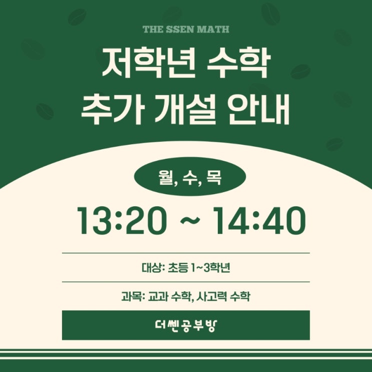 안녕하세요, 더쎈공부방입니다. 저학년 학생들을 위한 저학년 수학반이 추가로 개설되었습니다. 초등 저학년 시기는 수학의 기초 개념과 학습 습관을 처음 잡는 중요한 시기입니다. 단순히 문제를 많이 푸는 것보다 개념을 이해하고 스스로 생각하며 문제를 해결하는 경험이 무엇보다 중요합니다. 더쎈공부방의 저학년 수학 수업은 교과 개념을 차근차근 이해하면서 기초 계산력과 사고력을 함께 기르는 수업으로 진행됩니다. 수업 안내 대상 초등 1~3학년 수업 일정 매주 월·수·목 13:20 ~ 14:40 (주 3회, 80분 수업) 수업 내용 교과 수학 사고력 수학 개념 이해 중심 학습 풀이 과정 지도 및 학습 습관 형성 잔여석 2....... <img src="https://blogthumb.pstatic.net/MjAyNjAzMDVfODAg/MDAxNzcyNjk3MTk2ODU2.IoD05ljB1oVBBjLW5KB4ob1H_YSVb8Uwue8dNffWGB0g.GIyVU1nDKN-1L-KVXuRqHSD9ggAeVDRCRc1o75-uoWQg.JPEG/900%A3%DF1772696695793.jpg?type=s3" />