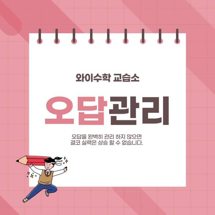 안녕하세요~ [신암동 수학] 와이수학입니다. 이번에는 '오답 관리'에 대해 얘기해 볼까 합니다. 수학공부에서 '오답관리'는 단순한 복습 그 이상의 의미를 갖습니다. 많은 친구들이 풀고 채점하는 것에서 공부가 끝났다고 착각하지만, 진짜 실력 향상은 틀린 이유를 마주하는 순간부터 시작됩니다. 왜 '오답관리'가 성적을 결정할까? 1) 내가 무엇을 알고 무엇을 모르는지 정확히 파악하는 능력을 '메타인지'라고 합니다. 오답 관리는 이 메타인지를 가장 빠르게 끌어올리는 도구입니다. 아는 문제를 또 푸는 것은 '확인'일 뿐이지만, 틀린 문제를 분석하는 것은 '성장'입니다. 2) ....... <img src="https://blogthumb.pstatic.net/MjAyNjAzMTZfMjM2/MDAxNzczNjQ2NjAzODk0.XkDCj3r1GqB8EmEhTk-A-po9jNyr4qQEocuoClk8ubAg.lv-B3SMqQxxTVDFfyGR5yKfmHJKpAbK3k1vWdCxgvmIg.JPEG/%BF%C0%B4%E4%B0%FC%B8%AE.jpg?type=s3" />