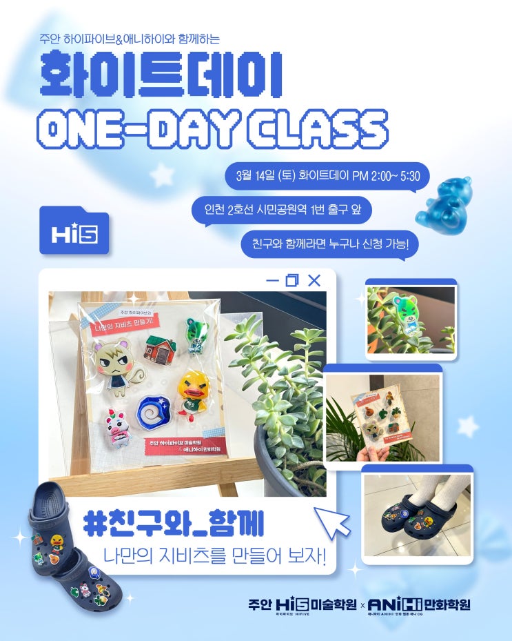 안녕하세요! 인천 미추홀구 미대입시 전문 미술학원 인천 주안 하이파이브 미술학원 & 애니하이 중등애니반입니다 지난 3월 14일 토요일 학원에서는 화이트데이를 맞이하여 친구와 함께하는 원데이 클래스 시간을 가졌습니다 정규 수업이 아닌 학생들도 친구와 함께 등원해서 열심히 그림을 그려주었답니다 디지털드로잉반 친구들은 SD캐릭터 틀을 주고 그 위에 자신만의 캐릭터, 또는 자신이 좋아하는 캐릭터를 표현할수 있도록 했습니다 처음인 학생들은 클립스튜디오와 액정타블렛이 많이 어려웠을텐데도 집중해서 예쁘게 그려주었어요 평소에 조용하던 학생도 시끌벅적한 학생도 친구와 함께 수업을 진행하니 즐거운지 쫑알쫑알 서....... <img src="https://blogthumb.pstatic.net/MjAyNjAzMTdfODAg/MDAxNzczNzIyOTQyMTA2.V3tJ3tpGAK5PMIuZ4ZxyfwDdRZxH_F8Lt6N_JbYuld4g.iexjVxRW-vRVzreSrLWvaDZ-UAf3KIJMEuuAtaM9XjYg.JPEG/KakaoTalk_20260309_190541950.jpg?type=s3" />