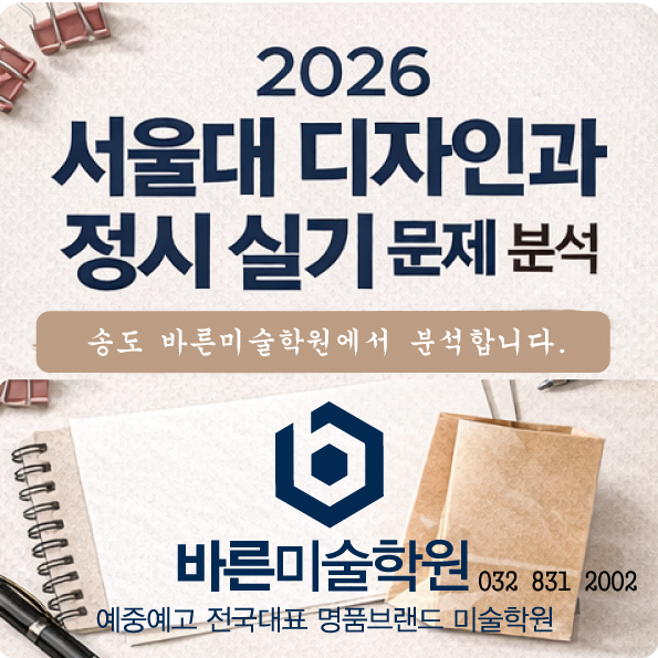 2026 서울대 미대 디자인과 문제 분석 안녕하세요, 인천 송도 바른미술학원입니다. 인천 송도에서 예중·예고 입시미술만을 전문으로 지도하는 유일한 학원으로, 전문성과 체계적인 커리큘럼을 바탕으로 학생들을 지도하고 있습니다. 이번 겨울 동안에는 자라나는 우리 학생들과 함께 하루하루 치열하게 수업을 진행하느라 블로그 포스팅을 잠시 쉬게 되었습니다. 학생들의 실력 향상을 위해 집중하다 보니 시간이 빠르게 흘렀네요. 이제 새 학기가 시작되었습니다. 미술학원은 겨울 특강 시즌보다는 시간적인 여유가 조금 생기는 시기이지만, 그렇다고 멈춰 있을 수는 없습니다. 이럴 때일수록 주요 미대들은 어떤 문제를 출제하는지, 출제 경향....... <img src="https://blogthumb.pstatic.net/MjAyNjAzMDNfMjEz/MDAxNzcyNTE2MDEyMzYz.uYtvAJLQs6XpP8P7rVn0X1sZoI8xs-TL7yMlJ-6U7kQg.25npTknOb5F6VfdExBxbQDeX5nB3lQgV8mFaU9jxN4Mg.JPEG/2026%BC%AD%BF%EF%B4%EB-%B5%F0%C0%DA%C0%CE%B0%FA-%B9%AE%C1%A6-%C1%A4%B8%AE.jpg?type=s3" />