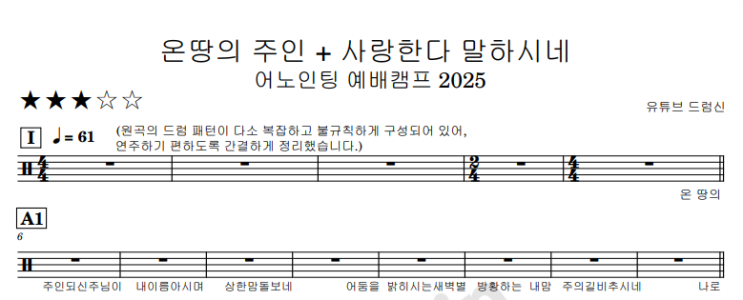 안녕하세요^^ 광주 최고의 시설 & 실용음악 전문학원 "블루실용음악학원" 입니다. "5"만 유튜버 "드럼신"원장님이 언제나 최고의 드럼실력으로 여러분과 함께 합니다 오늘 올려드릴 영상과 악보는 ' 어노인팅 ' 의 "온땅의 주인 + 사랑한다 말하시네 " 입니다 체계적인 노하우로 드럼 연주에 도움이 될 수있게 직접 정성껏 만들었습니다 드럼반주자 분들께 많은 도움이 되시기를 바랍니당^^ 즐겁게 감상해주셔요^^ 악보 구매 사이트 드럼 & 악기 & 보컬 레슨문의 네이버 톡톡 : 블루실용음악학원 카카오톡 : 블루실용음악학원 인스타그램 : @bluemusic_academy 디엠은 언제나 환....... <img src="https://blogthumb.pstatic.net/MjAyNjAzMDZfMTE2/MDAxNzcyNzczOTk5Nzg0.oFlahY9Y8oQ_tPC8SJnS9o2EmNu3DzPKtjGBCK1J4Jwg.gyzCha1FCsx_EGQCdL5tMd9D8-MFUlSGyAtEqmd7sIEg.PNG/%BF%C2%B6%A5%C0%C7%C1%D6%C0%CE%BB%E7%B6%FB%C7%D1%B4%D9%B8%BB%C7%CF%BD%C3%B3%D7_%BA%ED%B7%CE%B1%D7.png?type=s3" />