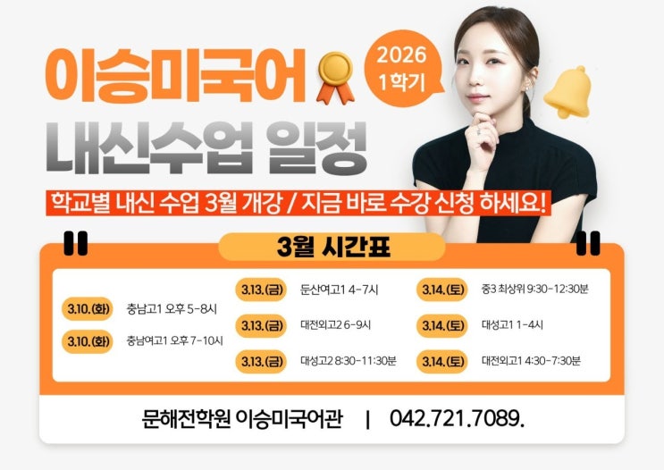 ♦️이승미국어 겨울특강 종강 안내♦️ 안녕하세요. 이승미통국어연구소입니다. 길었던 겨울특강 수업이 오늘로 종강합니다. 특강 동안 매주 현장 출석, 숙제, 테스트까지 하나도 빠짐없이 끝까지 함께해 준 예비 고1, 고2 학생들 모두 정말 수고 많았습니다. 한 주 동안 교재 준비 및 잠깐의 휴식기를 가지고 3월 내신반으로 다시 돌아오겠습니다. 이승미국어 3월 내신반 - 3.10.(화) 충남고1 5-8시 - 3.10.(화) 충남여고1 7-10시 - 3.13.(금) 둔산여고1 4-7시 - 3.13.(금) 대전외고2 6-9시 - 3.13.(금) 대성고2 8:30-11:30분 - 3.14.(토) 중등 최상위전략반 9:30-12:30분 (오전) - 3.14.(토) 대성고1 1-4시 - 3.14.(토) 대전외고1 4:30-7:....... <img src="https://blogthumb.pstatic.net/MjAyNjAzMTRfMjg0/MDAxNzczNDU0MTY3NTgx.vMHMeMGYZ1ZQn3Yj9jEDY21OARedm2InYgQTBmM3m7Yg.tGNysbX042nh5Hzc8DF-Z4ocEN9n0wm49QNXMBruR68g.JPEG/6_974Ud018svcqgbbqn6fjra1_ch08dy.jpg?type=s3" />