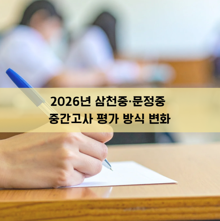 개학한 지 얼마 되지 않은 것 같은데 벌써 중간고사 일정이 나왔습니다. 문정중학교 1학기 중간고사는 4월 23일부터 시작됩니다. 시험 일정이 나오면서 함께 확인해야 할 변화가 하나 있습니다. 이번 중간고사부터 삼천중과 문정중을 포함해 중학교 평가 비율이 조금 달라졌습니다. 기존에는 지필시험 60%, 수행평가 40% 였다면 이번 시험부터는 지필시험 70%, 수행평가 30%으로 조정되었습니다. 숫자만 보면 작은 변화처럼 보일 수 있습니다. 하지만 실제로는 시험의 영향력이 더 커졌다는 의미입니다. 예전에는 수행평가 비중이 높았기 때문에 발표, 과제, 프로젝트 같은 활동 평가를 통해 어느 정도 점수를 보완하는 경우도 있었습니다. 그래....... <img src="https://blogthumb.pstatic.net/MjAyNjAzMTVfNDEg/MDAxNzczNTc2Mzc4OTEz.UgIZyKy1rKV8QGQh6BYnWiy5N6H3MZBgLgGOD3TXmB4g.Z8gLn5NsOlnnCGU96-cXqyYSbJ4ODe5ZYztAa5uE45Qg.PNG/image.png?type=s3" />