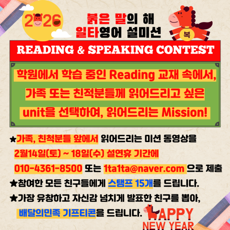 안녕하세요, 일타영어학원입니다 ❤️ 2월 설 연휴를 맞이하며, 초등부에게 의미있는 연휴를 보내고자 설미션을 부여했습니다 자신감을 가지고 또랑또랑한 목소리로 가족분들 앞에서 이야기를 읽어드리는 모습들을 보니, 학원에서 열심히 학습한 흔적들이 엿보여 보기 좋았습니다 ❣️ 설미션에 열정을 가지고 참여한 모든 학생들에게 박수를 보내며, 이제 위너즈를 발표하겠습니다 위의 이미지의 친구들이 우승자들입니다 우승한 4명의 해당 학부모님께 배민 기프티콘을 보내드리겠습니다 축하드립니다 그 외 참가학생들 모두에게는 5월 마켓데이....... <img src="https://blogthumb.pstatic.net/MjAyNjAzMTRfMjgx/MDAxNzczNDQ0NTE4Njc5.iuqOiGtOoHYX1Q-6b5sYQjxNUB5D5IdWnQiw3IxAPlUg.__0fuuoE8Yl49GNRfwHtpTkBedA68J9g5v6eQd8U5zMg.PNG/900%A3%DF1770284118454.png?type=s3" />