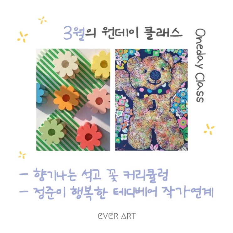 안녕하세요 작가주의 미술교육원 에버아트입니다 :) 이번 11월 원데이 클래스는 정준미 행복한 테디베어 작가연계 수업과 향기나는 석고 꽃 커리큘럼으로 두 가지 클래스로 진행합니다 각 클래스는 아이들이 행복을 전하는 방법과 따뜻한 마음을 전하는 시간이 될거예요 :) 정준미 작가 연계 클래스는 따뜻하고 포근한 감성을 바탕으로 “나만의 행복한 테디베어 만들기”를 주제로 진행될 예정이에요 :) 작가의 작품처럼 부드럽고 포근한 질감과 사랑스러운 이야기가 가득한 테디베어들은 아이들에게 따뜻한 마음과 편안함, 그리고 행복한 에너지를 전해 줍니다 아이들은 부드러운 색채와 섬세한 표현법으로 자신만의 따스하고 귀여운 테디....... <img src="https://blogthumb.pstatic.net/MjAyNjAzMTFfMjg4/MDAxNzczMTk2NjI5NTQ5.FdGTnyXO0K8Yodjdk-ovTTYgBGZ2P4V30KDzZvFqDzgg.2mlVTgyt-bnvvpxOTq1l-KgC8dYCi-1tVrjKQq66Aqkg.JPEG/IMG%A3%DF6013.JPG?type=s3" />
