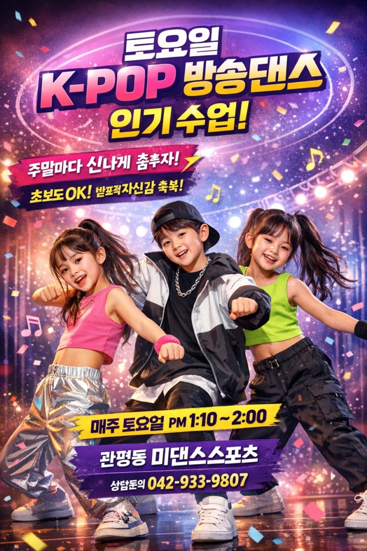 토요일 방송댄스 인기 계속되는 이유! 아이들이 기다리는 주말 K-POP 방송댄스 수업 대전 관평동 미댄스스포츠에서 꾸준히 사랑받고 있는 토요일 방송댄스 수업! 이미 많은 친구들이 참여하고 있는 인기 주말 수업으로 주말마다 신나게 춤추며 스트레스를 풀고 자연스럽게 리듬감과 표현력을 키우고 있습니다. 요즘 아이들이 가장 좋아하는 K-POP 방송댄스를 중심으로 기초부터 차근차근 배우기 때문에 처음 춤을 배우는 친구들도 부담 없이 참여할 수 있습니다 토요일 방송댄스가 인기 있는 이유 ✔ 아이들이 좋아하는 최신 K-POP 안무 수업 ✔ 친구들과 함께 배우는 즐거운 분위기 ✔ 자연스럽게 길러지는 자신감과 발....... <img src="https://blogthumb.pstatic.net/MjAyNjAzMDZfMTQz/MDAxNzcyNzcwOTkxNzY4.x86i7GSApY8X82RQbN3FCNFSUDDH0iYTmc7LfZw29Fcg.SM376Kf7DK_3zBItVQZDdZ9iRB-9mZBB_4e1q_glY-Ag.JPEG/AB026377%A3%AD1BA0%A3%AD4883%A3%AD9600%A3%ADA6536FA12C40.jpg?type=s3" />
