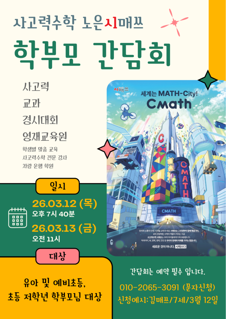 대상 : 유아 및 예비초등, 초등 저학년 학부모님 일시 : 26.03.12 (목) 오후 7시 40분, 26.03.13 (금) 오전 11시 신청 방법 : 010-2065-3091 (문자신청) (신청예시: 김매쓰/7세/3월 12일) <img src="https://blogthumb.pstatic.net/MjAyNjAzMDdfNzAg/MDAxNzcyODE0NTg4MzE1.vHHXzyhBsSxB5l52lVnnuHajC9ZQYpiqPF7MihFLP74g.Ft-4Ps5a8LqE1kvnJ30p2aQAKaw45MifAaiZVKa1tMYg.PNG/Green_and_Yellow_Design_Conference_Poster.png?type=s3" />