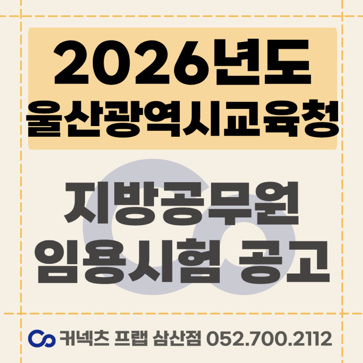 안녕하세요 커넥츠 프랩 삼산점입니다! 2026년도 울산교육청 지방공무원 임용시험 공고가 확인 되었습니다. 2026년도 교육행정 9급 선발은 15명 입니다. 전산 2명 사서 2명 공업(일반기계) 2명 경채-공업(일반기계)1명 작년 2025년에는 20명 선발이였으나, 올 해 15명 선발로 인원감소가 있었습니다. 한 달 뒤 부터는 응시원서 접수가 시작 됩니다! 응시원서는 인터넷 접수만 가능하며 온라인교직원채용(https://edurecruit.go.kr) 에서 기한내 원서접수 하시기 바랍니다. 삼산점 052-700-2112 신정점 052-700-2115 무거점 052-707-2112 태화우정점 052-700-2118 <img src="https://blogthumb.pstatic.net/MjAyNjAzMDNfMjc2/MDAxNzcyNTE4MDE4MzQw.YutGjzezvXt0ygXSJ2RCw95goITe6ZIz_qjm-rGMSo4g.O0Y3SNzPQQTSLZtDn36ereOMoMpdSGn_OYErNbK94Wgg.PNG/%B0%F8%B0%ED_%2825%29.png?type=s3" />