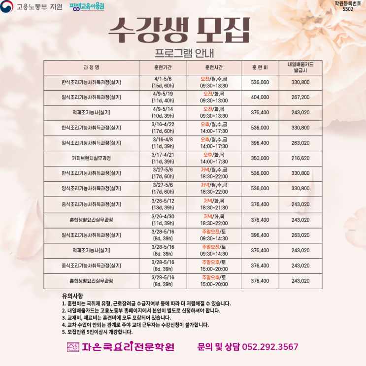 자은쌤이예요. 울산 #내일배움카드 #국비훈련기관 #평생교육이용권 사용기관 자은쿡요리전문학원의 프로그램 공지드립니다 :) 많은 관심 부탁드립니다 개강예정 3월 28일 중식조리기능사취득과정 (주말반) 3월 28일 혼합생활요리실무과정 (주말반) 3월 28일 일식조리기능사취득과정 (주말반) 3월 27일 한식조리기능사취득과정 (저녁반) 3월 26일 중식조리기능사취득과정 (저녁반) 4월 1일 한식조리기능사취득과정 (오전반) 4월 9일 일식조리기능사취득과정 (오전반) 3월 17일 카페브런치실무과정 (오후반) - 개강확정 많은 관심과 많은 신청 바랍니다. 떡제조기능사(실기) 2026년도 2회차 실기시험 대비 3월28일~5월16일 (주말반 09:30~14:30) 이....... <img src="https://blogthumb.pstatic.net/MjAyNjAzMTBfNzcg/MDAxNzczMTA1NzIwNjg3.jR590A4nVxxrrf_31GdxMHrgB1i2SifSz-SjFMq9YNsg.73jXPKfeeuEr32HZ4GC_zcdDilW_2WtR5T9afqfmJHkg.PNG/%BC%F6%B0%AD%BB%FD_%B8%F0%C1%FD.png?type=s3" />